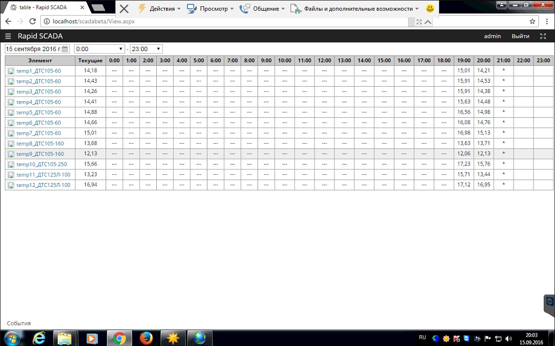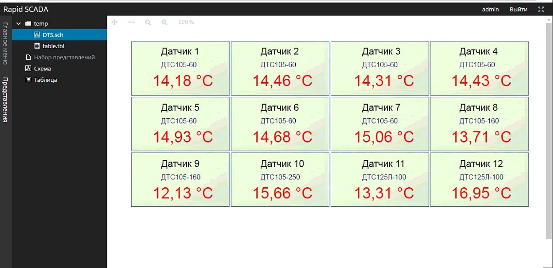Система построена на базе аналоговых датчиков серии ДТС на основе платины PT100, подключенных в трубопроводы через бобышки и в воздушном исполнении для измерения температуры воздуха на улице и под землей. Модули ввода опрашиваются по локальной сети через программное обеспечение верхнего уровня на базе Rapid SCADA.