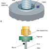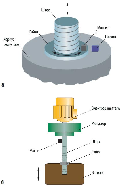 Для управления всеми типами задвижек, конструкция которых позволяет контролировать число оборотов вторичного вала, предназначена другая модификация прибора — ОВЕН ПКП1И. Принцип работы этого прибора аналогичен принципу работы прибора ОВЕН ПКП1Т, но вместо времени хода задвижки между концевыми положениями контролируется число оборотов вторичного вала привода, а вместо контроля тока электропривода отслеживается период следования импульсов, поступающих от датчика, установленного на вторичном валу привода. Такой принцип работы обеспечивает более точное определение положения механизма, при этом время открытия и закрытия может быть различным. В качестве датчика оборотов вала в простейшем случае может применяться пара геркон — магнит. Магнит крепится на вращающуюся гайку штока задвижки (рис. 2, а) или на вторичный вал, положение которого при вращении вдоль собственной оси остаётся неизменным (рис. 2, б). Геркон на держателе располагается напротив магнита.