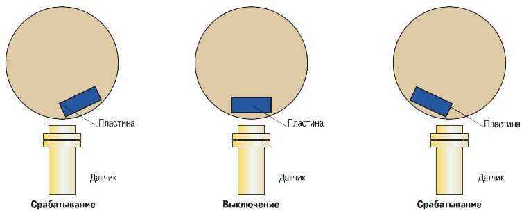 В новой модификации прибора введён параметр, в котором задаётся время, в течение которого разрешён счёт после выключения управления. Это значительно повышает правильность счёта оборота вала при наличии движения задвижки по инерции. Для воздействия на индуктивный датчик лучше использовать стальной прут круглого сечения. Можно применить и узкую пластину, так как при использовании широкой пластины может произойти срабатывание датчика при приближении пластины, выключение при прохождении и вновь включение при удалении (рис. 3). Если точности позиционирования при одном импульсе на оборот вала недостаточно, то на вращающийся элемент (гайку редуктора или шток с неизменным положением вдоль своей оси) нужно установить не один, а несколько элементов воздействия на датчик — магнитов или металлических стержней (рис. 4).