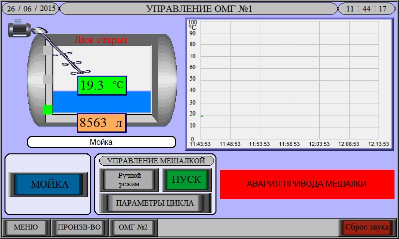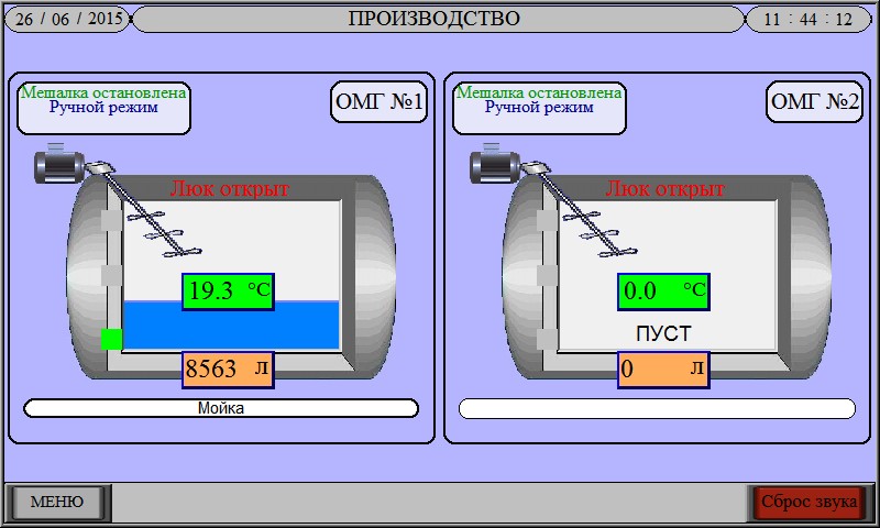 - Управление мешалкой. Мешалка может работать непрерывно, так и по циклам «работа-пауза». Блокировка работы мешалки при открытии люка емкости, и, в случае необходимости, при недостаточном количестве продукта в емкости.