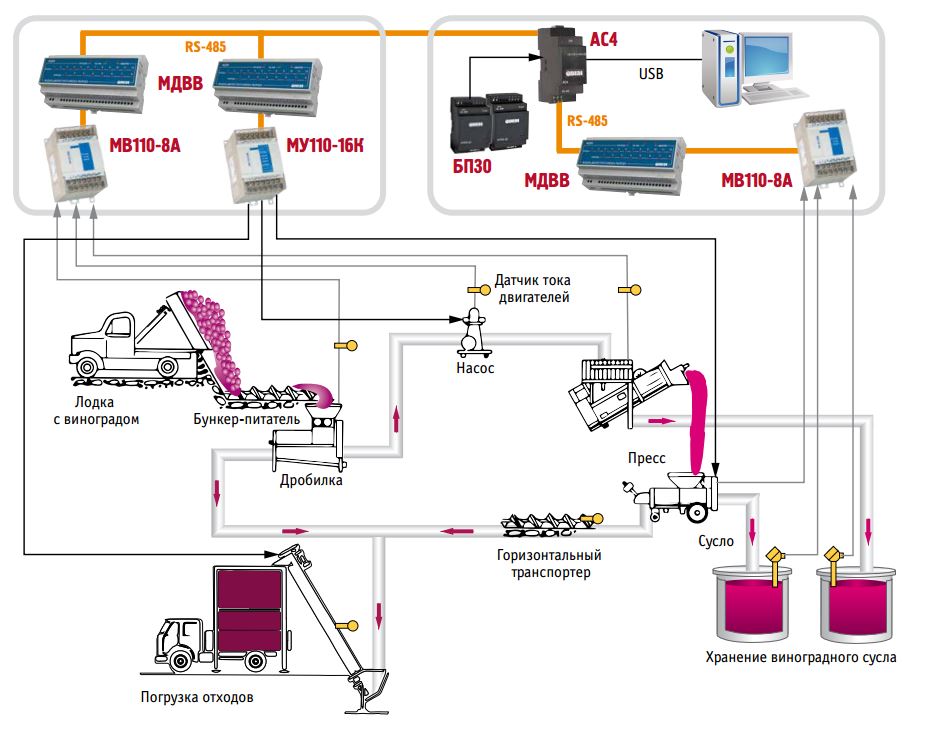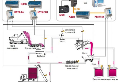 Основные управляющие компоненты системы расположены в цеху. Кроме основных элементов, используются: частотные преобразователи, устройства плавного пуска, электромагнитные контакторы, датчики тока и напряжения, штатные датчики уровня сусла, установленные на различном оборудовании переработки винограда.