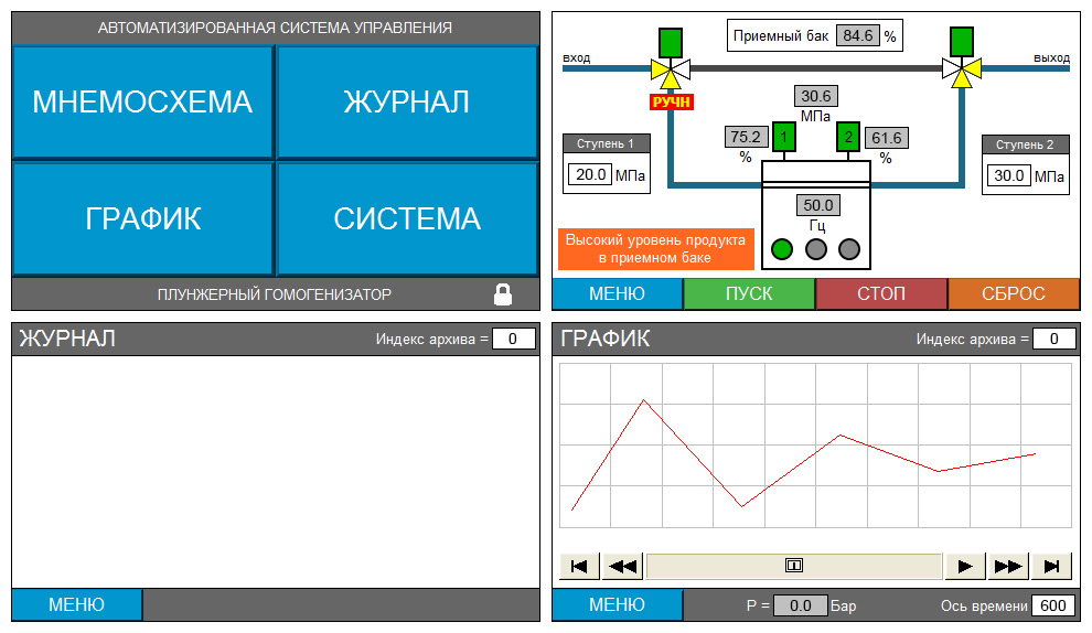 Создание АСУ заключалось в разработке нового пульта управления плунжерным гомогенизатором взамен китайской системы управления, поставляемой в комплекте с гомогенизатором, без изменения используемых датчиков и исполнительных механизмов. Перед компанией ПРОЕКТ-П была поставлена задача спроектировать недорогой пульт управления плунжерным гомогенизатором на базе надежных и современных средств автоматизации. Исходя из этого было принято решение разработать пульт управления на базе программируемого логического контроллера ОВЕН ПЛК160. Выбор данного контроллера обусловлен невысокой стоимостью оборудования, наличием на борту контроллера необходимого количества дискретных и аналоговых входов и выходов.