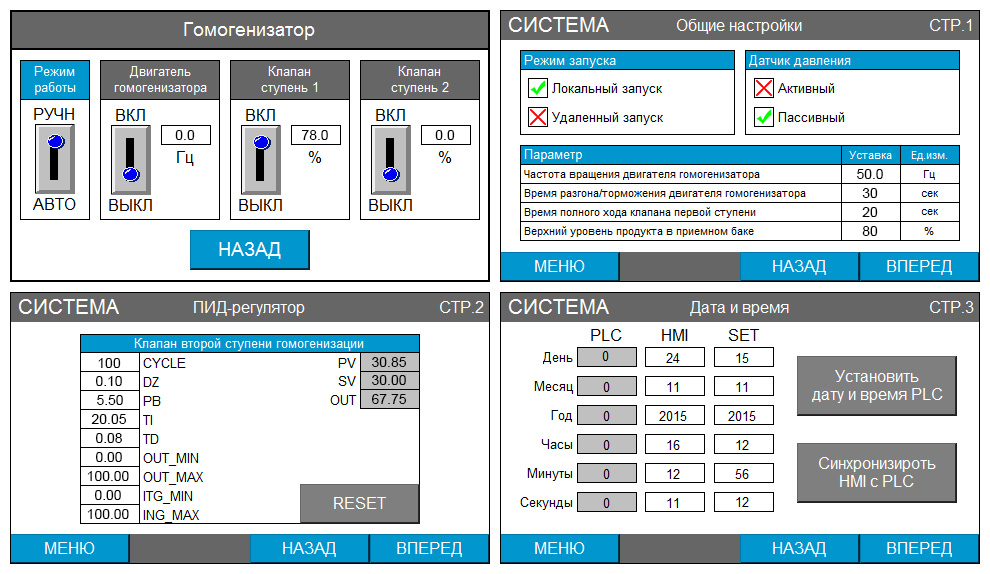 На панели оператора задается время полного хода клапана первой ступени гомогенизации, которое определяет скорость набора давления первой ступени гомогенизации. Если в течение времени полного хода клапана первой ступени гомогенизации давление гомогенизации не выходит на заданную уставку – инициируется авария «Авария давления первой ступени гомогенизации», и процесс гомогенизации останавливается.