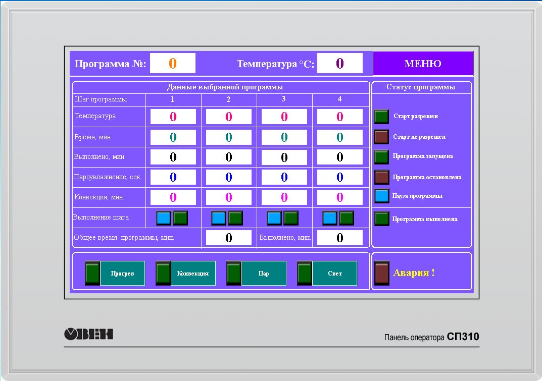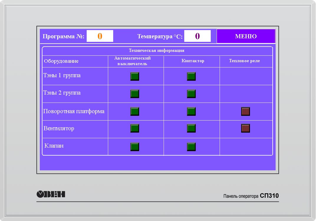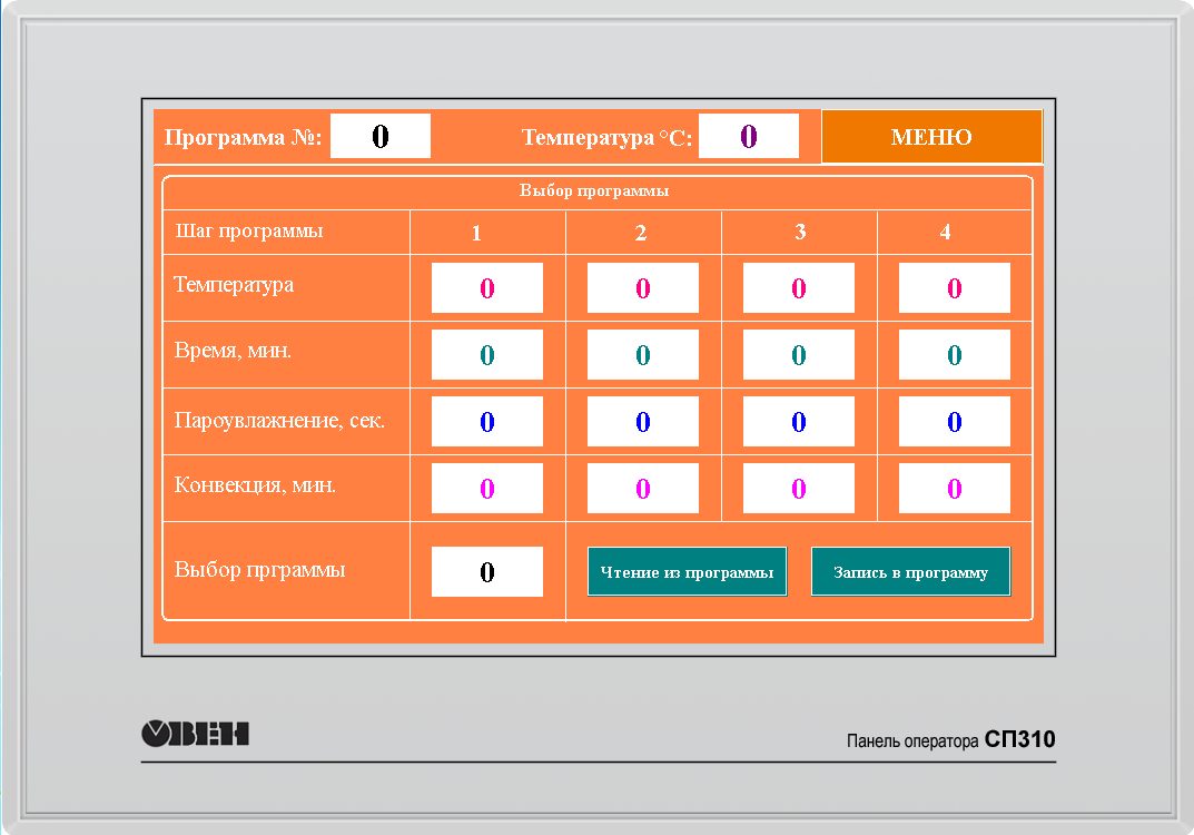 В основе щита управления — программируемое реле ОВЕН ПР200 с модулем расширения ОВЕН ПРМ-1, сенсорная панель оператора ОВЕН СП310-Б. Для питания автоматики применяется блок питания ОВЕН БП30Б. Для контроля температуры — датчик температуры ОВЕН ДТС035М. Управление пекарным шкафом осуществляться в ручном и автоматическом режимах по сигналу от датчика температуры, установленного в пекарном шкафу. В автоматическом режиме управления обеспечивается поддержание заданной температуры в пекарном шкафу, а также выполняется отсчет времени до завершения выполняемой программы.