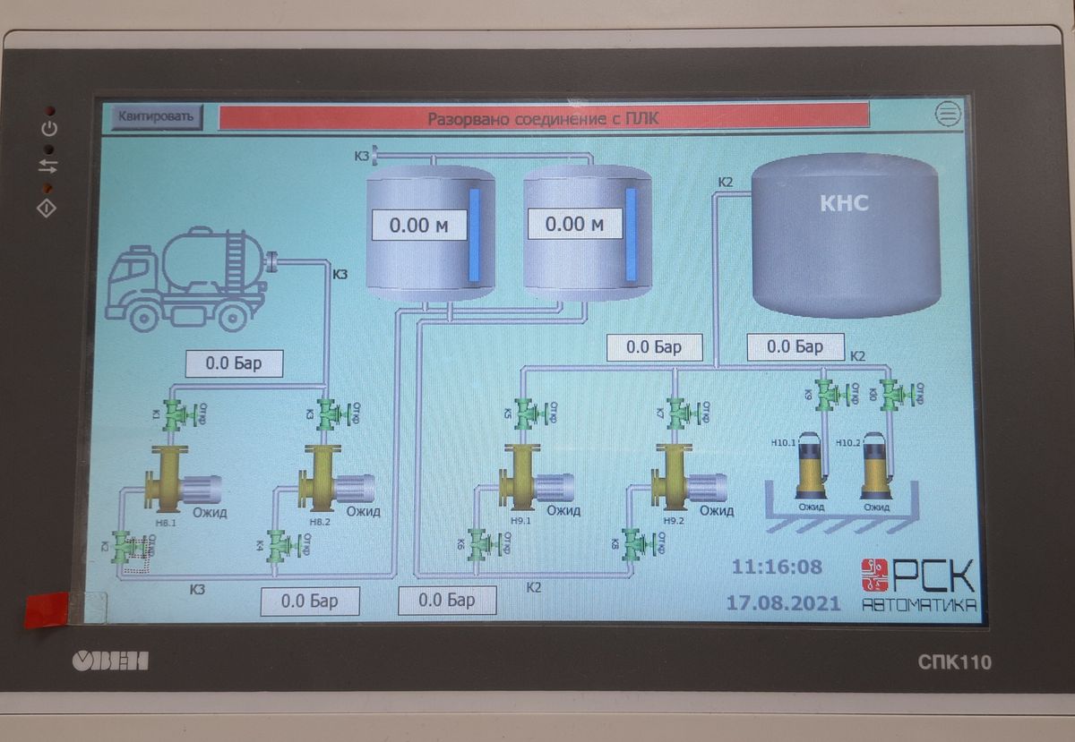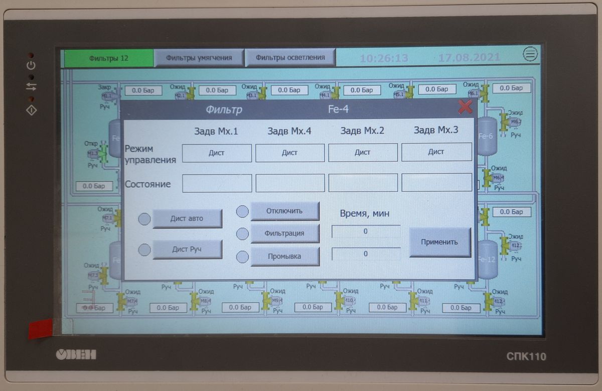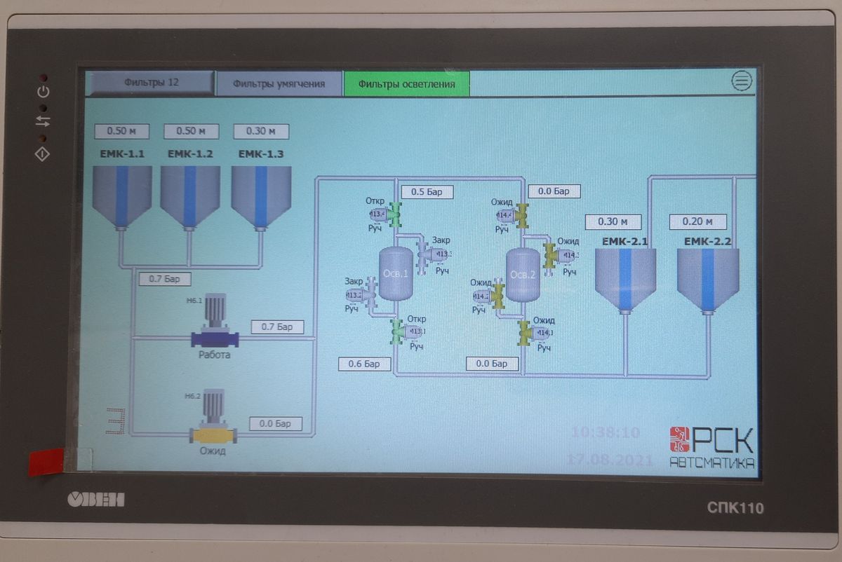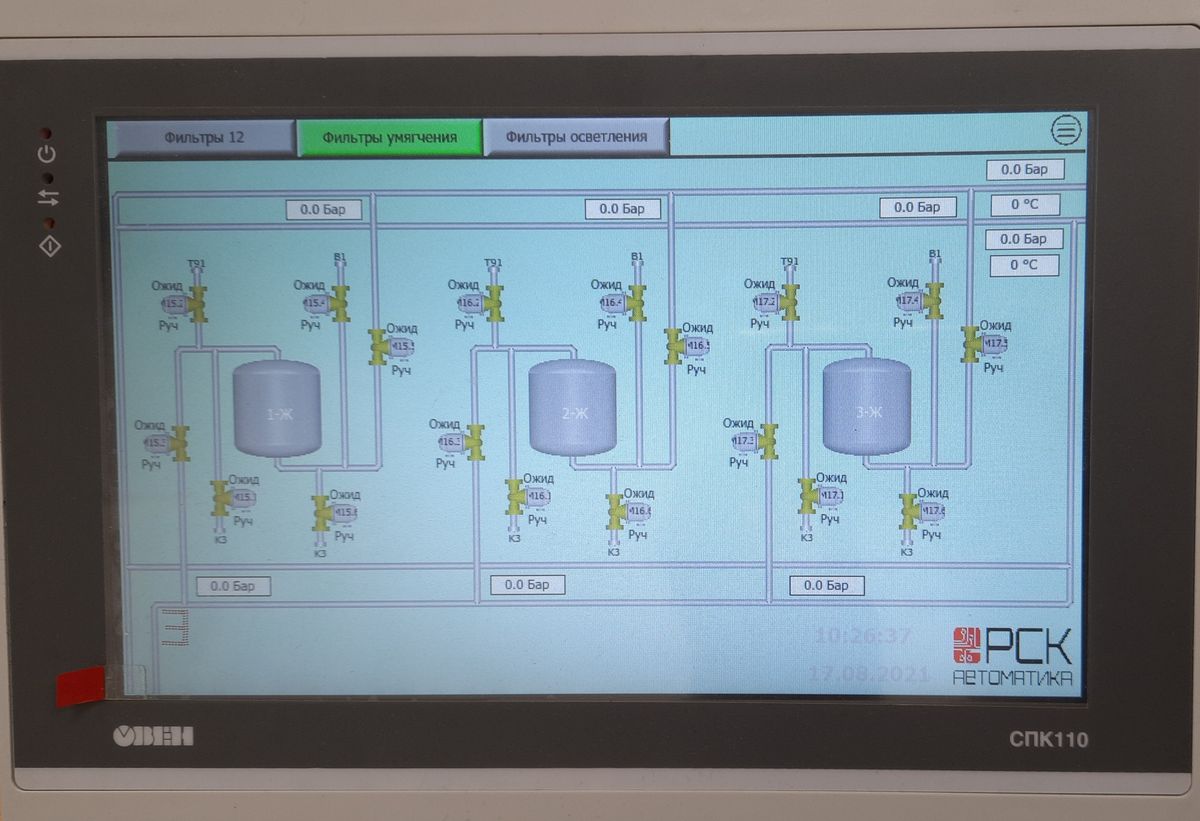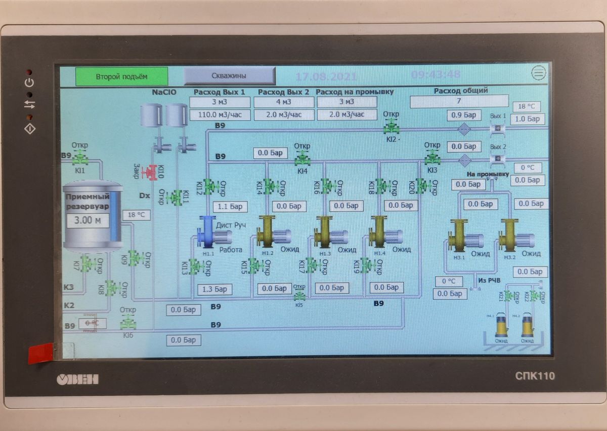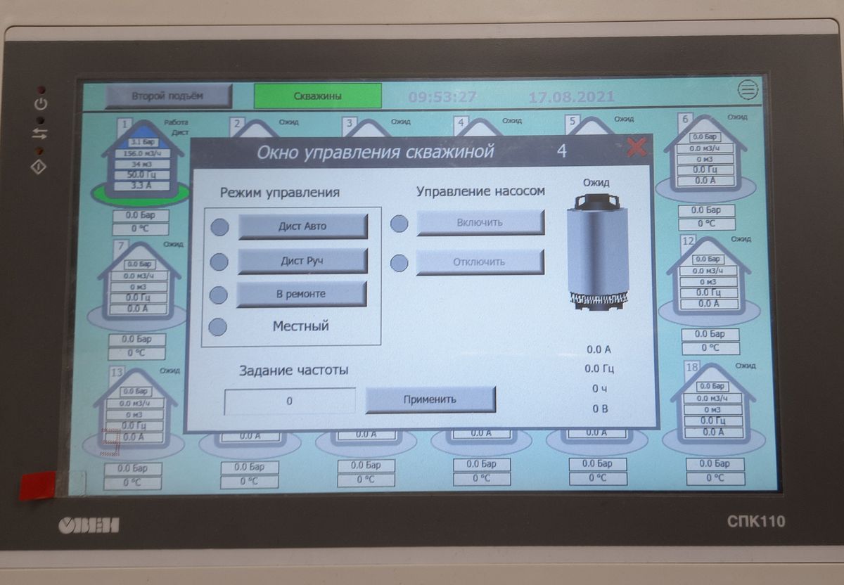 Станция водоочистки имеет диспетчерскую-операторную на базе MasterSCADA 4D. Система диспетчеризации и управления дублируется на независимых сенсорных панелях (СПК110), установленных локально, которые интегрированы со СКАДА-системой. СПК110 установлены по месту: на блоке водоочистки, 2 и 3 подъёме и станции очистки промывной воды. Доступ к СПК110 оператор также имеет с диспетчерской через web-браузер. Контроль и управление скважинами также осуществляется через СКАДА и через СПК110, установленной в блоке водоочистки. Оператор имеет возможность удалённо настроить необходимый режим работы скважинных насосов и отслеживать их параметры. Также оператор задаёт верхний и нижний предупредительный и аварийный уровень давления на напоре насосов, благодаря чему происходит защита как самих насосов, так и оборудования станции.
