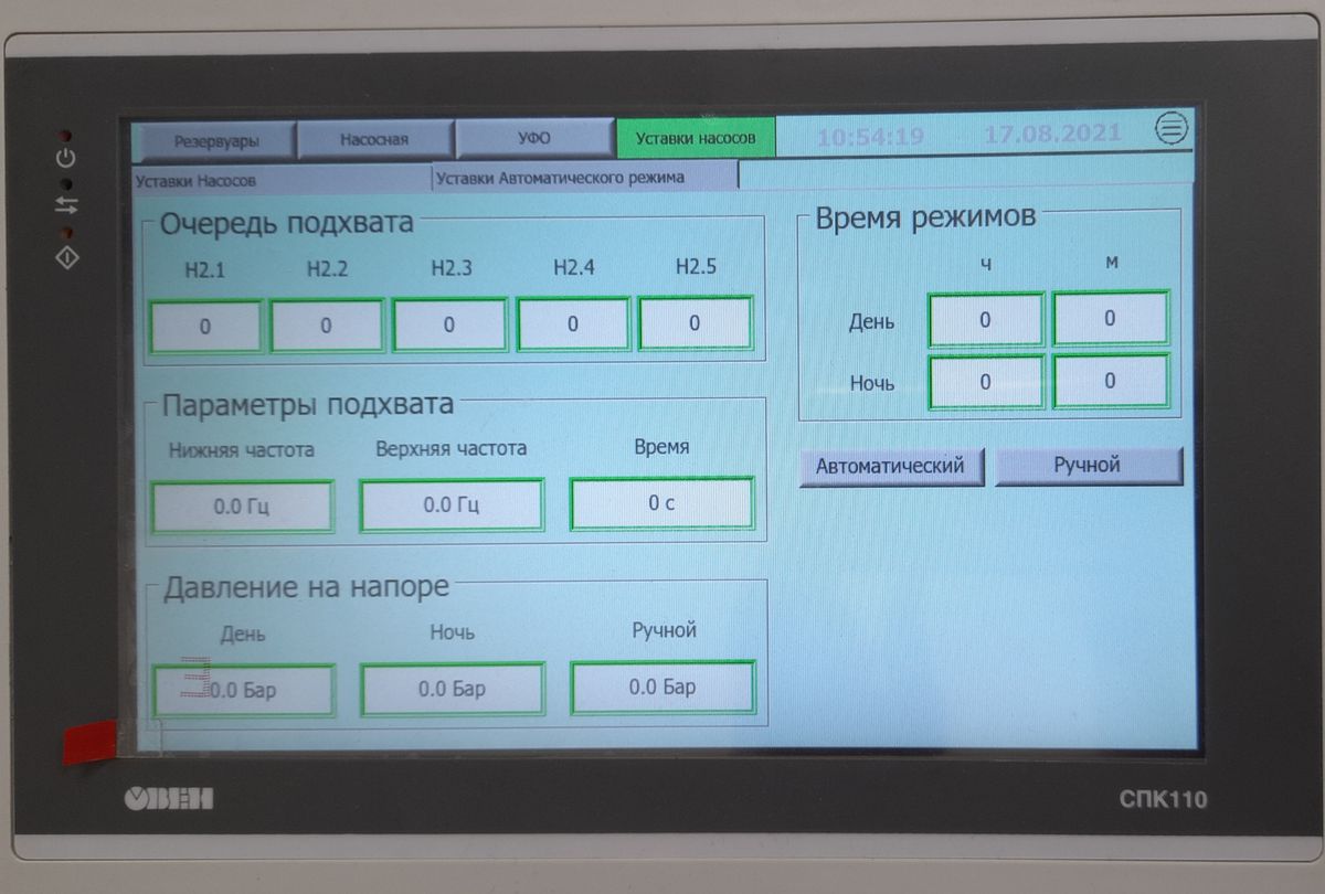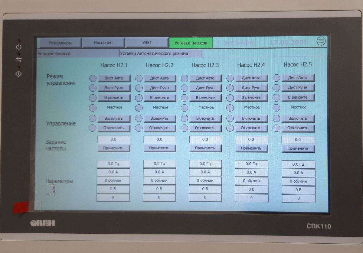 Управление насосами и задвижками осуществляется по выбору: в дистанционном ручном (через СКАДА или СПК), дистанционном автоматическом (ПЛК), ручном (посредством прямого пуска через щиты управления). Так для дистанционного автоматического режима управления насосами 3-го подъёма имеются настройки работы в автоматическом режиме на вкладке «Уставки насосов» (см. фото), где оператор задаёт очередь и параметры подхвата насосов, а также давление на напоре подачи воды в город в зависимости от времени суток, благодаря чему происходит плавное регулирование давления.