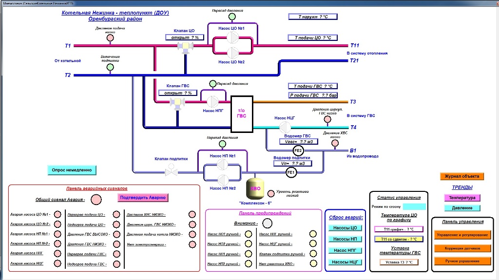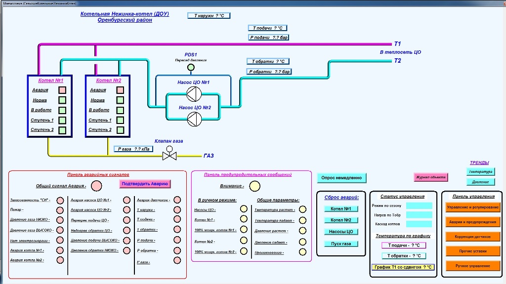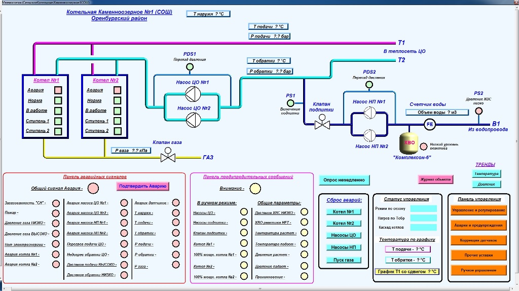 Кроме того, в феврале 2013 года в систему диспетчеризации включена блочно-модульная котельная, по которой сейчас выполнен комплекс работ по обеспечению дистанционного контроля параметров. Для этого был собран дополнительный щит с ПЛК ОВЕН и установлено дополнительно большое количество датчиков. Управление котельной пока осуществляет штатная система автоматики. Однако, информационные и функциональные возможности дополнительно установленной системы автоматизации намного выше, чем у заводской. Поэтому, предполагается в дальнейшем осуществить переход полностью на новую систему автоматизации.