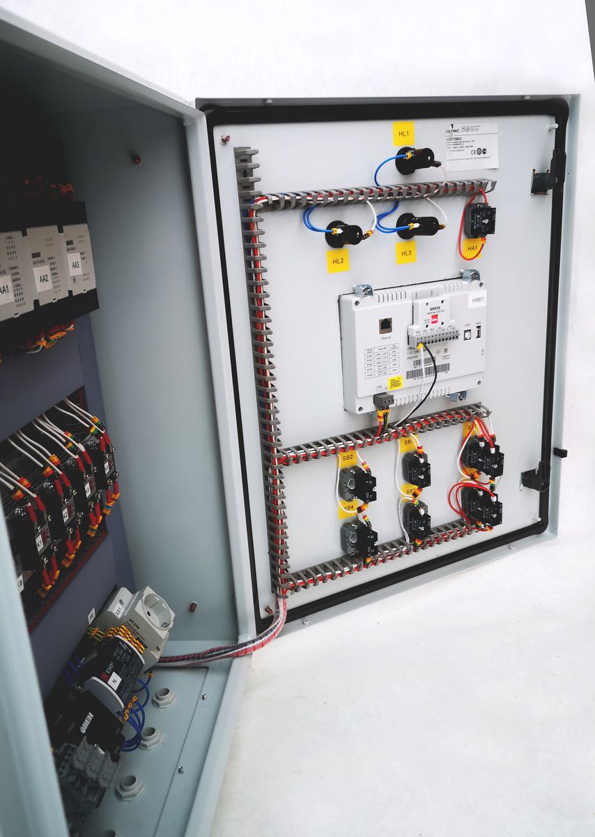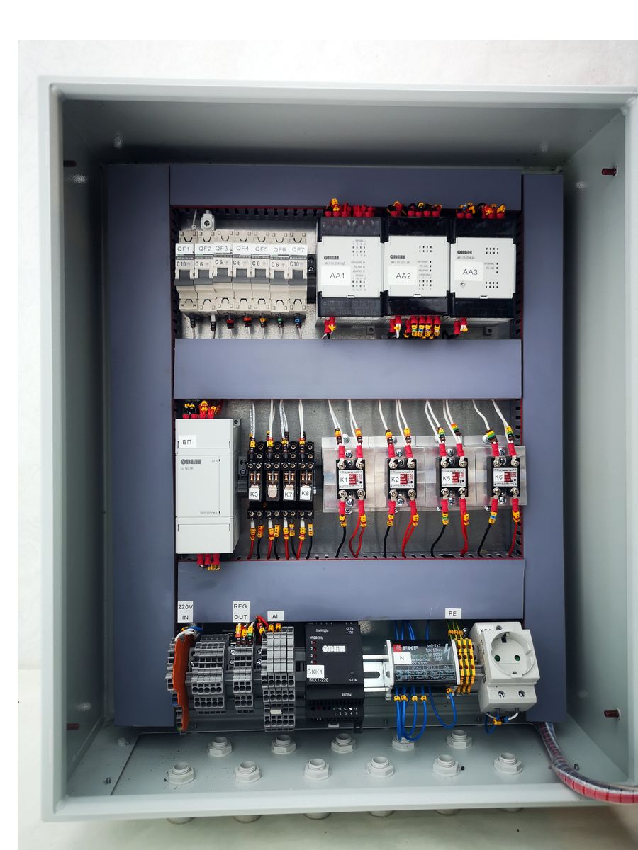 Автоматическое поддержание уровня, давления и температуры осуществляется при помощи сенсорного панельного контроллера ОВЕН СПК107[М1], для измерения текущих параметров и управлением исполнительными механизмами используются модули ввода-вывода ОВЕН Мх110. Управление исполнительными механизмами осуществляется посредством промежуточных и твердотельных реле от KIPPRIBOR.