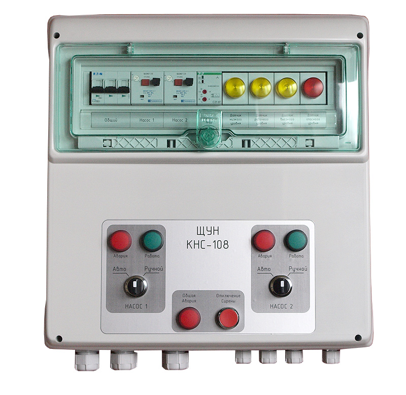 Щит управления насосами предназначен для регулирования насосов канализационных систем. Алгоритм работы аналогичен алгоритму прибора управления насосами Grundfos LCD 108…SD.