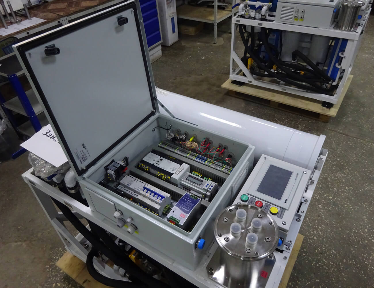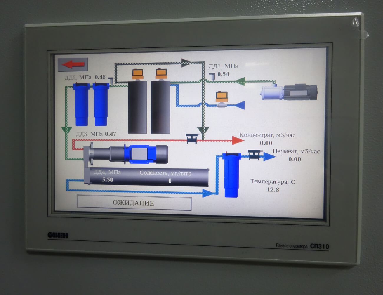 - дополнительно опреснительная установка может комплектоваться станцией химической очистки мембраны, щит управления которой реализован на базе программируемого реле ПР200.