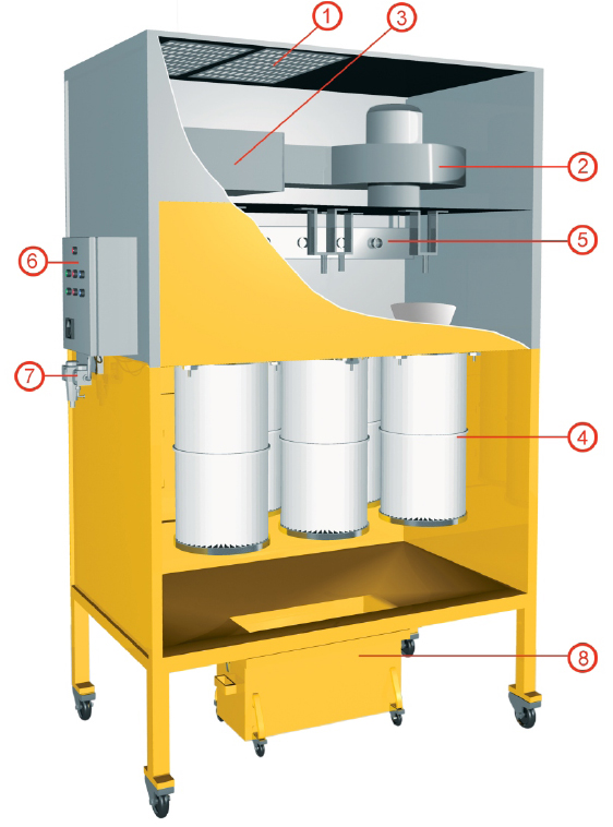 – конечный фильтр (1), вентилятор вытяжки (2) с шумоглушителем (3) или без него, предназначенный для прокачки загрязненного воздуха через системы отделения пыли и возврата воздуха в производственное помещение;