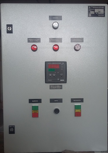 Щит управления построен на базе оборудования ОВЕН. В состав щита входит программируемое реле ПР110-220.12ДФ.8Р, измеритель-регулятор двухканальный ТРМ202-Щ2-РР. В системе используется преобразователь давления ОВЕН ПД150-ДИВ200П-809-1,5-1-P, индикаторы аварий, другое оборудование (выключатель/разъединитель напряжения, автоматические выключатели, силовые контакторы). Оборудование, расположенное на лицевой панели щита, предназначено для контроля технологических параметров котла.
