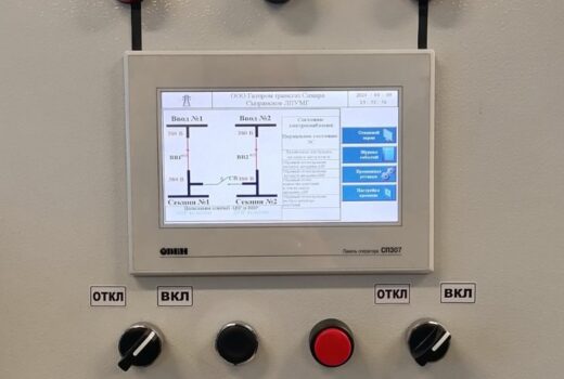 В рамках проекта было разработано управление тремя автоматами (двумя вводными и одним секционным между ними) с возможностью отображения информации на экране и записи событий в журнал. Для этого был выбран контроллер ОВЕН ПЛК110-24.Р-М и сенсорная панель ОВЕН СП307-Б, чтобы минимизировать количество кнопок на лицевой панели шкафа.