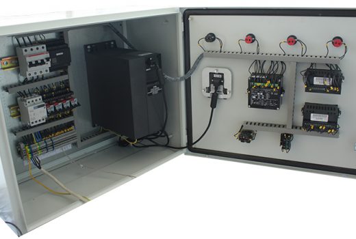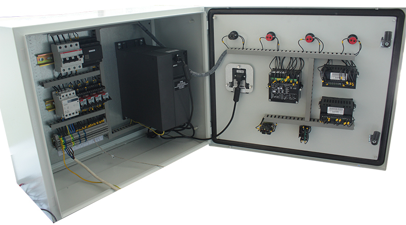 Другие технические характеристики шкафа управления: напряжение питания: ~380 В, количество фаз – 3, максимальный ток нагрузки – 32 А, IP54, 500×600×300 мм.