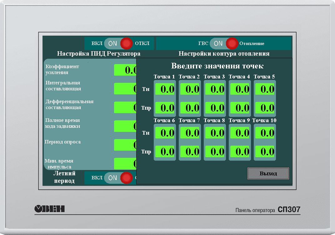 - Отображение графиков изменения регулируемых величин с функцией ведения архива на панели оператора.