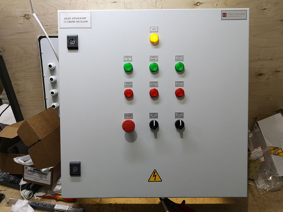 Шкаф управления группой сетевых насосов мощностью 2,2 кВт разработан на базе программируемого реле ПР200 и модуля расширения ПРМ-1.