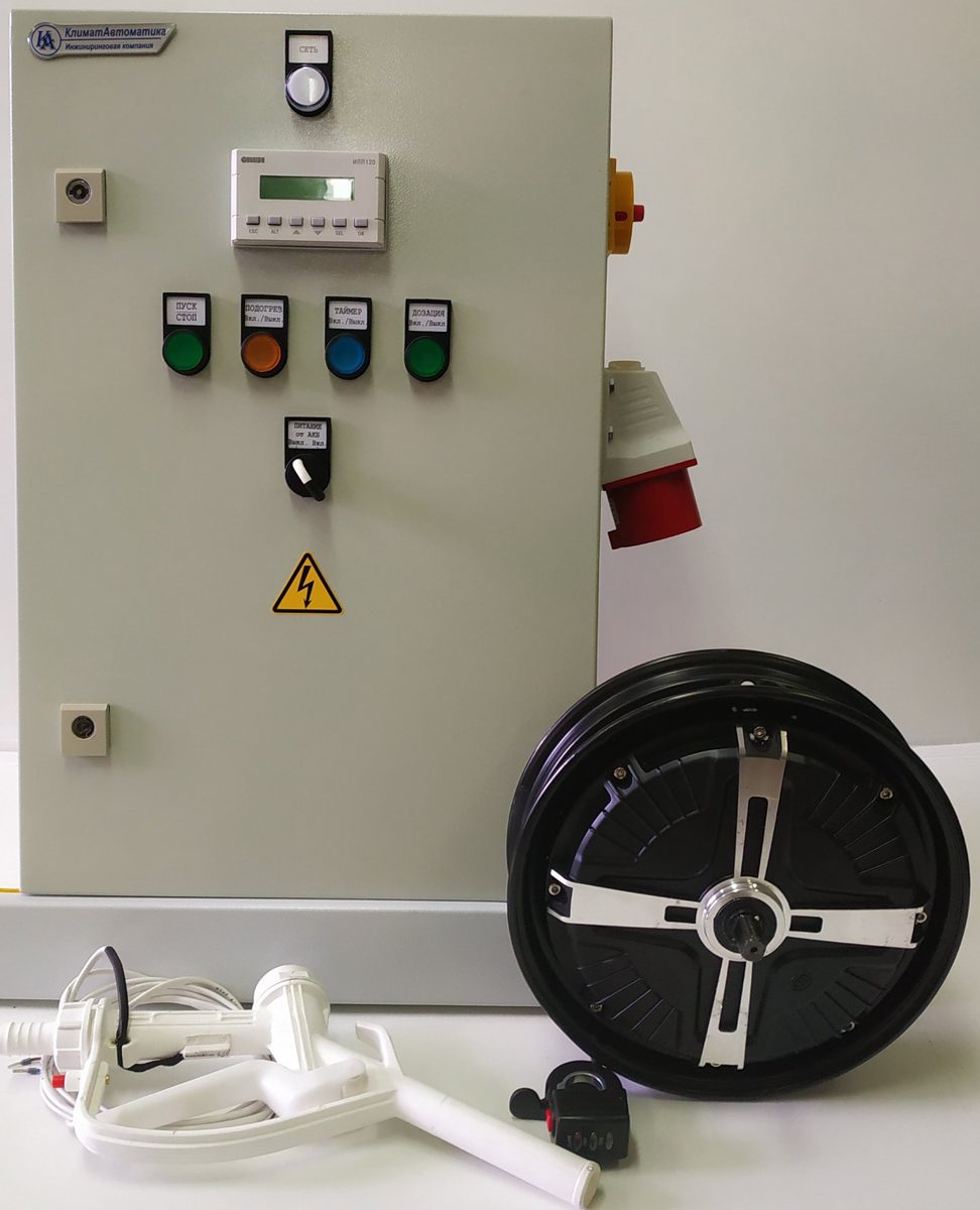 Разработан шкаф управления системой пастеризации молока, дозированной выдачей молока и передвижением бочки с молоком посредством электрической тяги на мотор-колесе мощностью 500 Вт, напряжением 24 В.