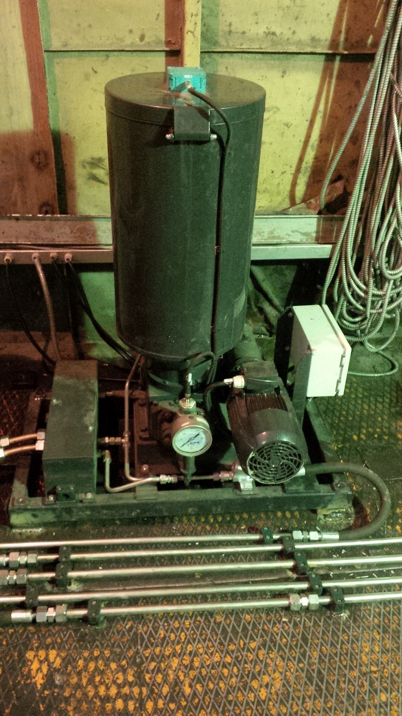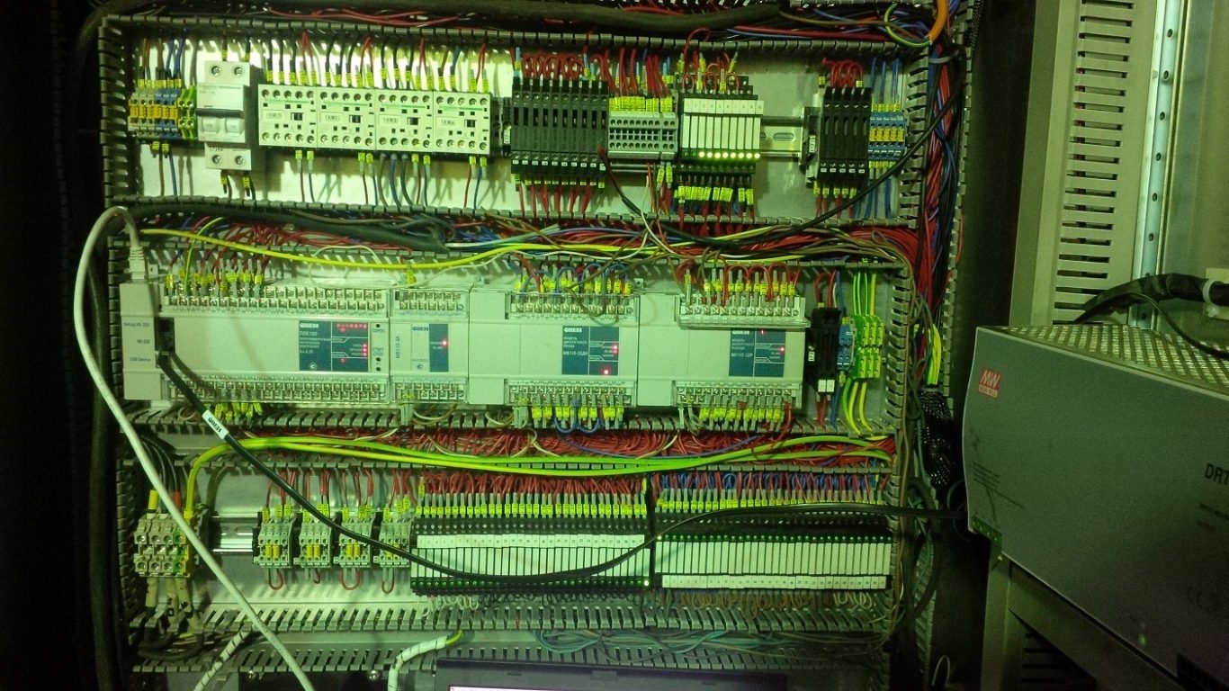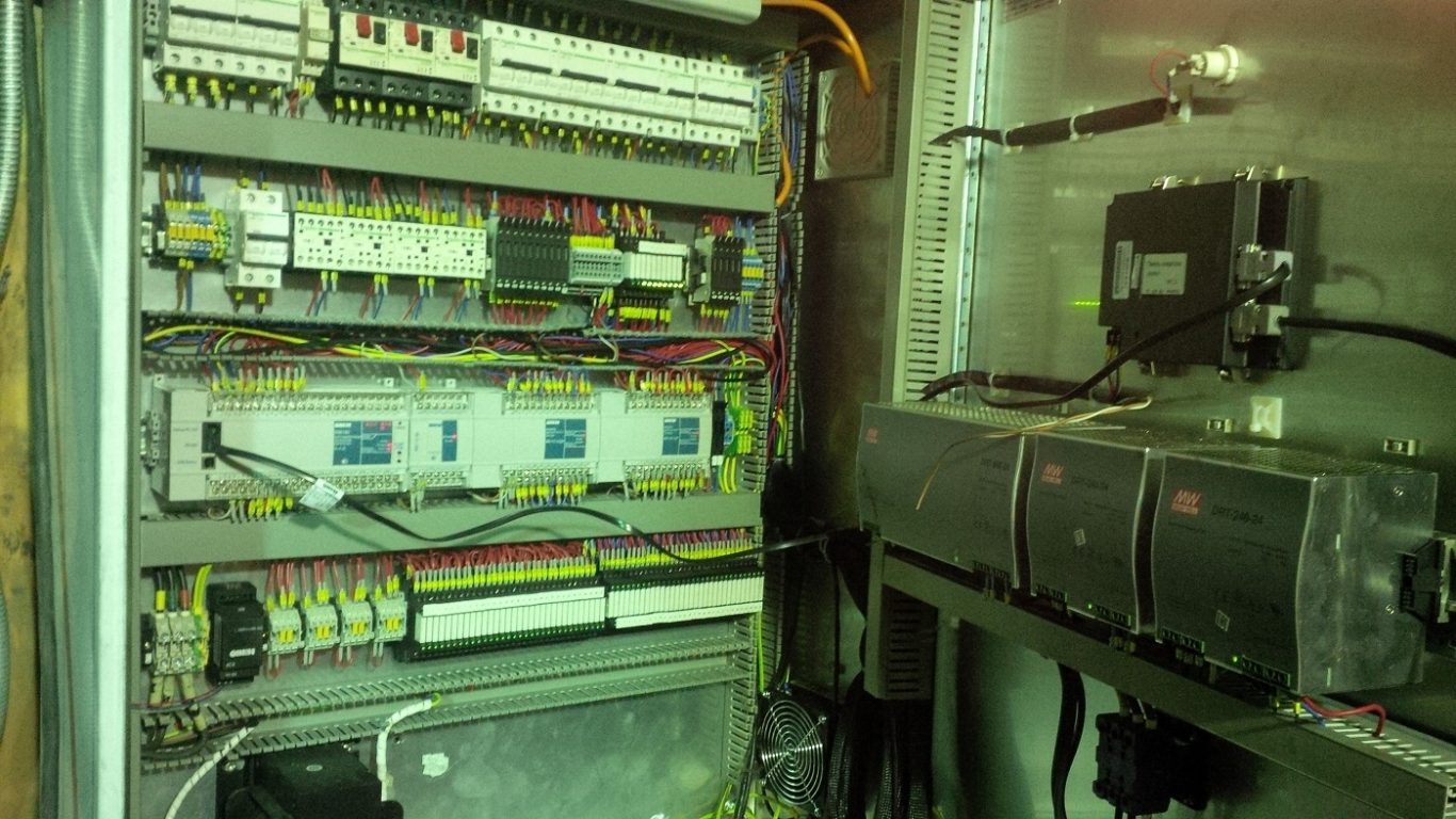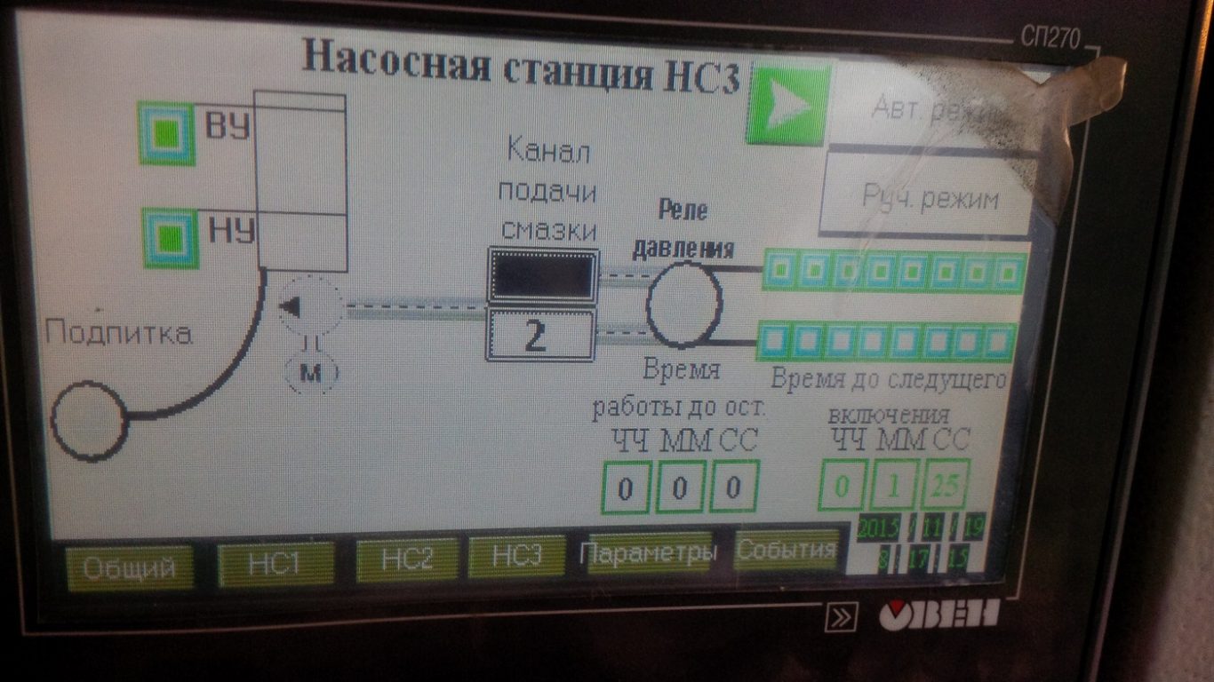 Шкаф управления построен на базе оборудования ОВЕН: программируемого логического контроллера ПЛК160, модуля дискретного ввода МВ110-32ДН, модуля аналогового ввода МВ110-8А, модуля дискретного вывода МУ110-32Р и сенсорной панели оператора СП270. ШУ системой смазки в автоматическом режиме в заданные промежутки времени включает насосные станции и отключает их по достижению необходимого давления в подающей магистрали. Вторая панель оператора находится в кабине машиниста. В ручном режиме управление осуществляется либо с панели в кабине машиниста, либо с панели на шкафу. Обе панели оператора одновременно работают с одним контроллером ОВЕН ПЛК160.
