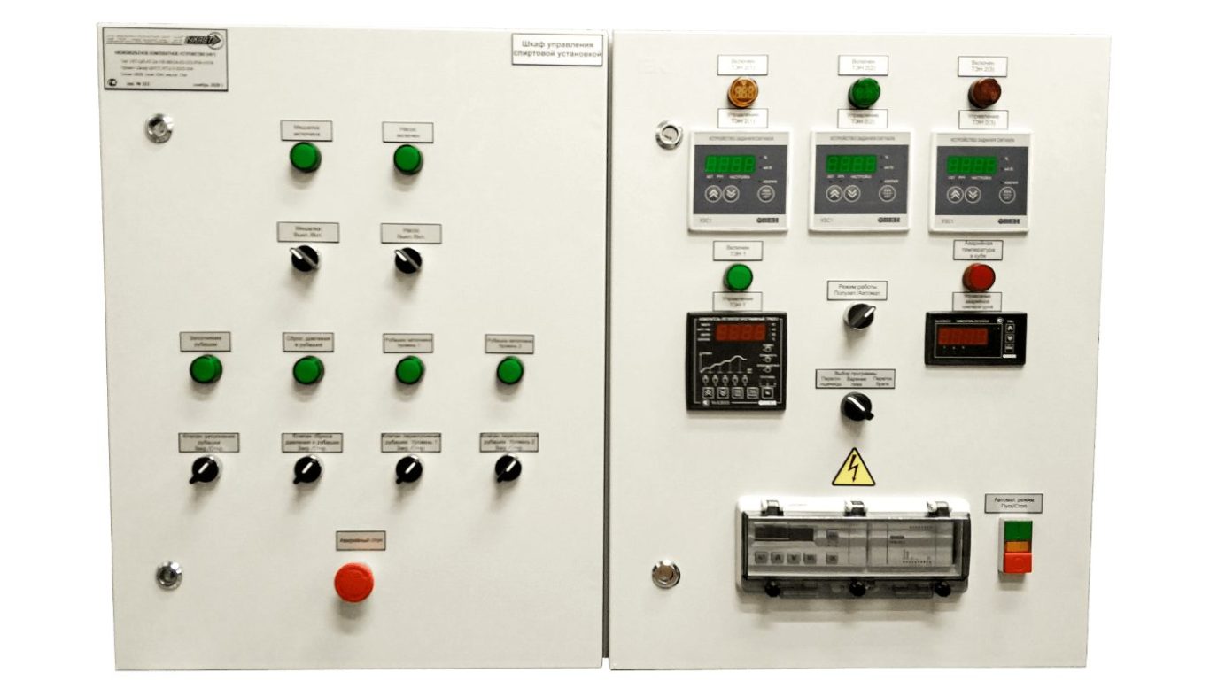 Спиртовая установка представляет собой пароводяной котёл (ПВК) с установленными датчиками температуры в рубашке, в кубе, аварийным датчиком температуры и датчиком давления в кубе. Подача воды в рубашку ПВК, сброс давления в рубашке, а также ограничение уровня переполнения рубашки осуществляется через электромагнитные клапаны. В ПВК установлены 2 трёхфазных ТЭНа общей мощностью 12 кВт. Управление ТЭНами в зависимости от режима работы и производится от измерителя-регулятора ТРМ251, цифрового задатчика сигналов УЗС1 или программируемого реле ПР200. Система автоматики также позволяет управлять перекачивающим насосом и мешалкой с помощью частотных преобразователей.