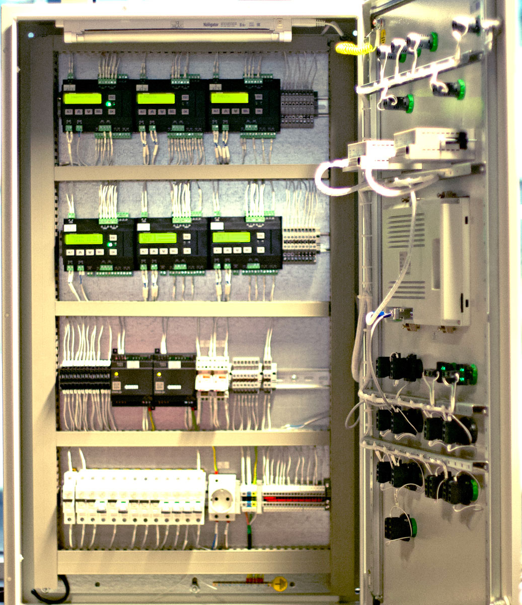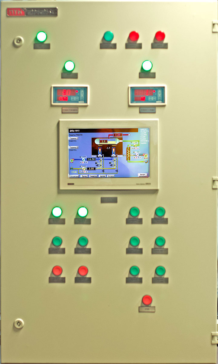 Шкаф построен на базе оборудования ОВЕН. В его состав входит комплект программируемых управляющих многофункциональных устройств — программируемых реле с дисплеем ОВЕН ПР200, сесорная панель оператора ОВЕН СП310, цифровые индикаторы ОВЕН СМИ1 или СМИ2 для удобной индикации давления газа, воздуха, выходной величины нагрузки, уровня воды или расхода воды, а также индикаторы единичные режима горелок, автоматические выключатели электропитания исполнительного оборудования, клеммные ряды внешних подключений. В системе используются нормирующие датчики-преобразователи давления и температуры согласно проекту автоматизации, газовое оборудование ГК «АМАКС» (блоки газооборудования АМАКС-БГ), другое оборудование (регулирующая заслонка газа, приводы заслонок и регулирующих клапанов систем регулирования).