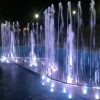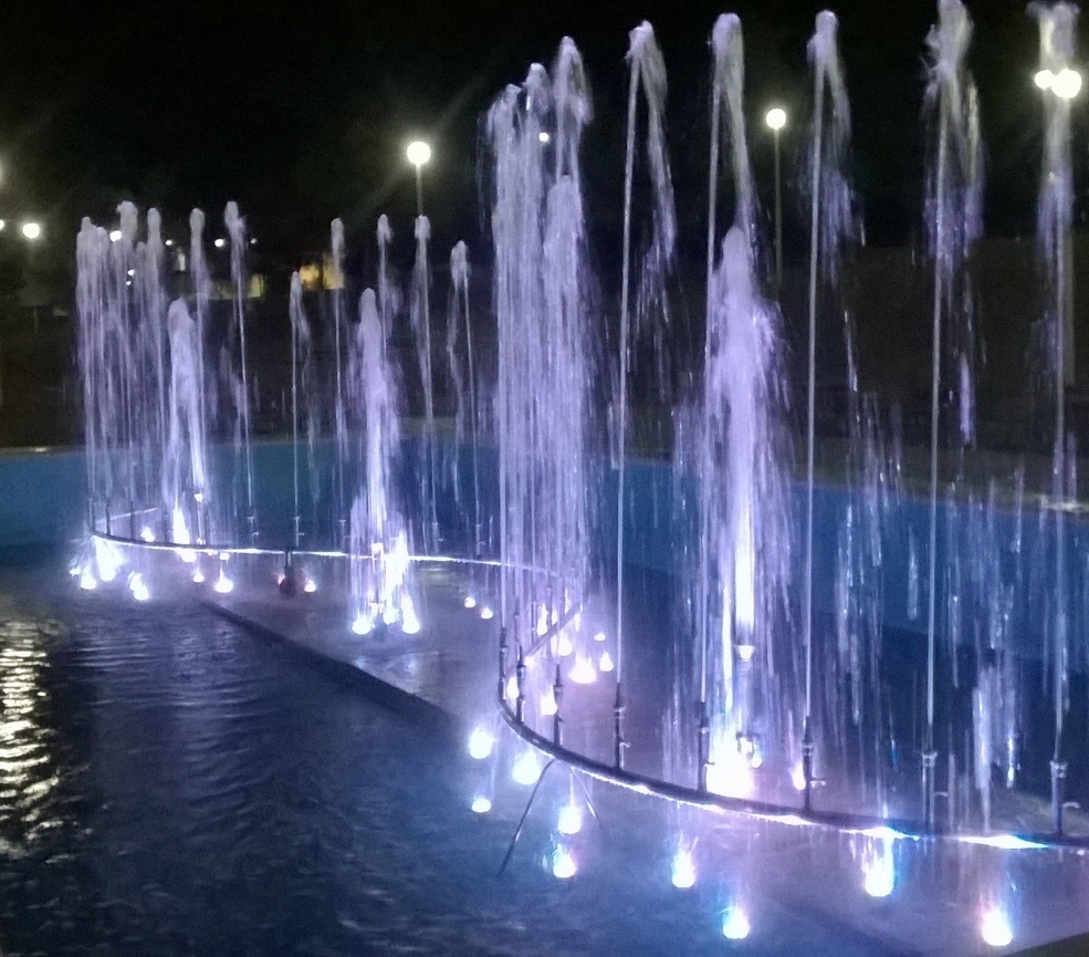 Сценарии работы подсветки и управление струями воды синхронизированы по времени. Два фонтана, входящие в фонтанный комплекс, также работают синхронно.