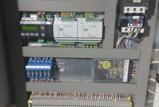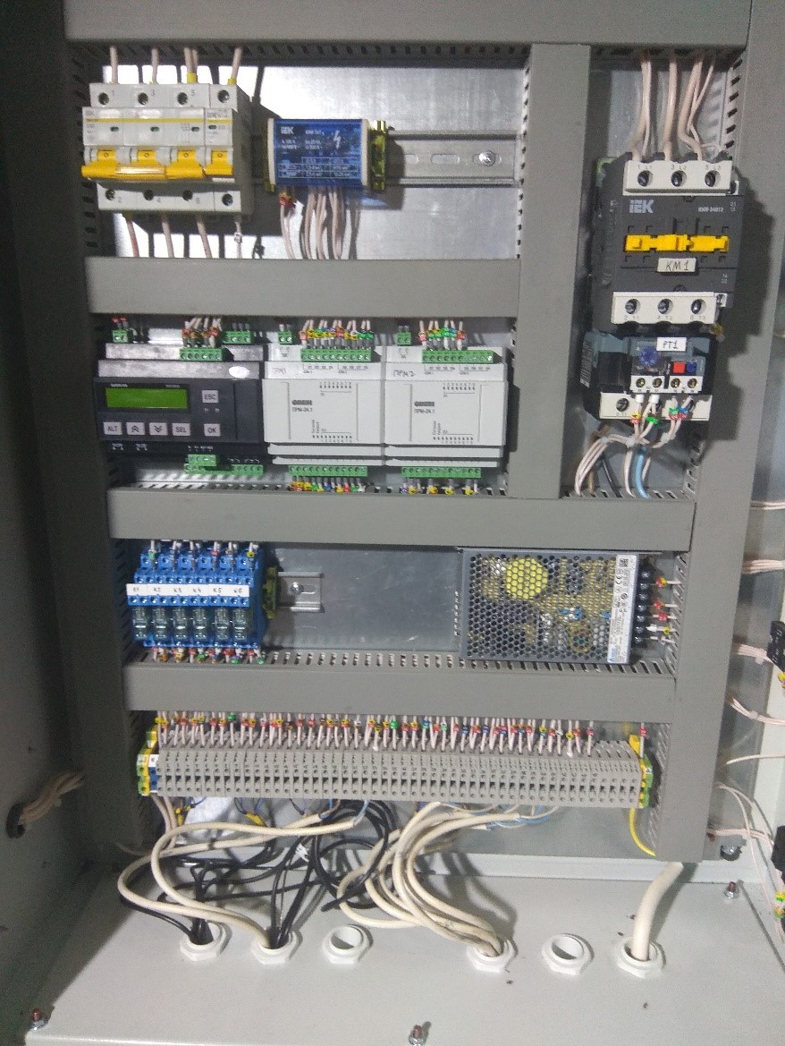 Основу систему управления составляет программируемое реле ОВЕН ПР200 с модулями расширения входов/выходов ОВЕН ПРМ-1. Контроль температуры масла осуществляется через аналоговый вход ПР200 термометром сопротивления ДТС054. Контроль уровня масла осуществляется с помощью датчика-реле уровня ПДУ-1. Ручное управления загрузочным ящиком и пуансонами в ручном режиме реализуется с помощью четырехпозиционного джойстика MTB2-PA24, управление толкателем реализуется с помощью двухпозиционного джойстика MTB2-PA22.