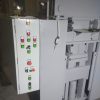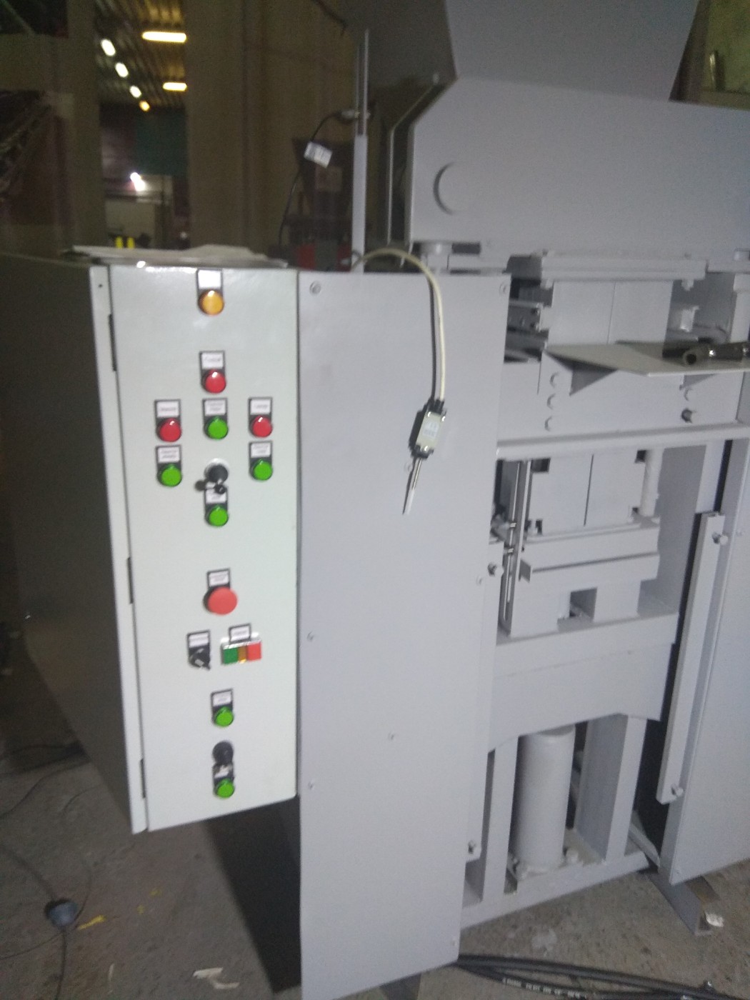 Система управления обеспечивает работу станка и контроль аварийных ситуаций. Предусмотрено два режима работы линии – ручной режим и полностью автоматический режим. В ручном режиме обеспечивается управление всеми исполнительными устройствами станка. Автоматический режим обеспечивает выпуск продукции без участия человека. Обеспечивается загрузка сырья в матрицы, процесс прессования, выгрузка готового изделия при помощи пневматических захватов, управление конвейером с готовой продукцией. Осуществляется контроль за температурой и уровнем гидравлического масла и индикация о её превышении, контроль и сигнализация уровня сырья.