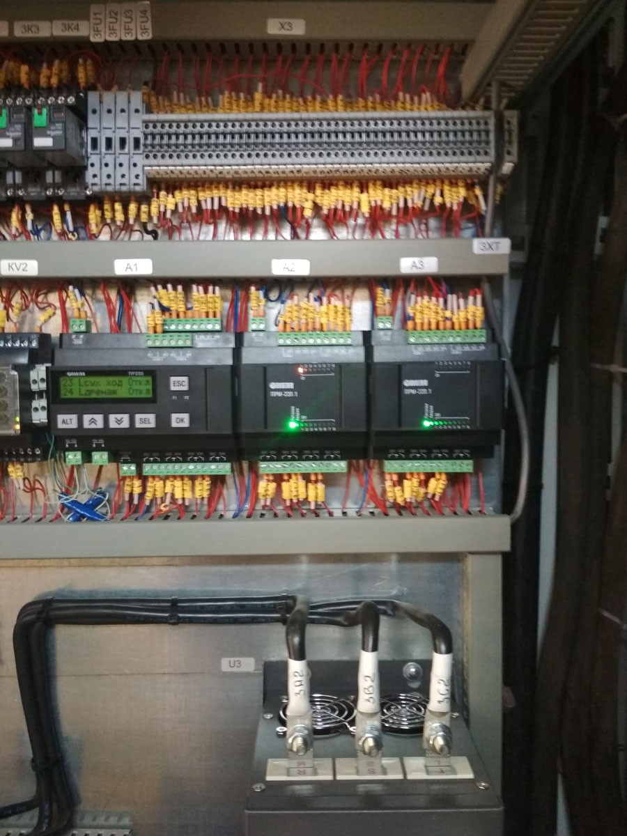 Система выполняет автоматическое управление насосами канализационно-насосной станции по оригинальному алгоритму в соответствии с техническим заданием заказчика.