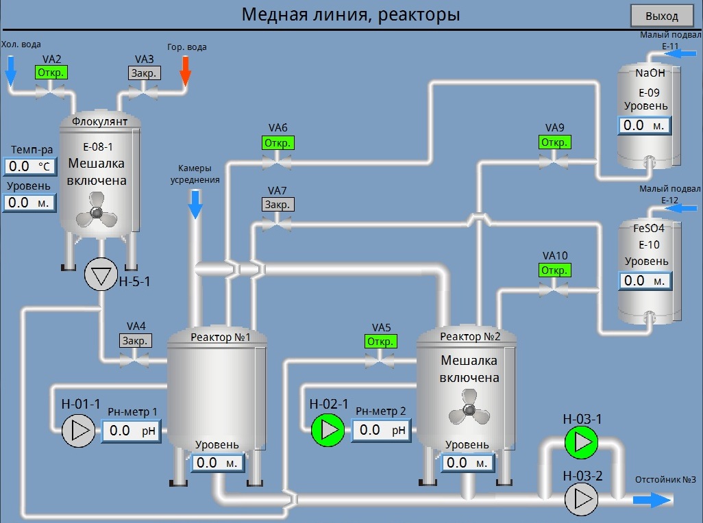 - визуализацию работы всей линии обезвреживания (насосов, клапанов, мешалок, заполнения емкостей);