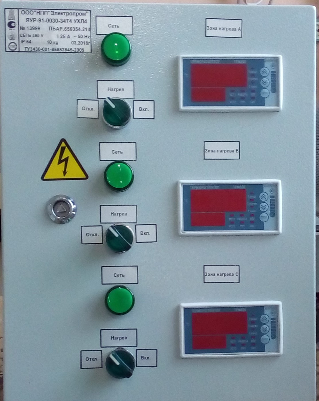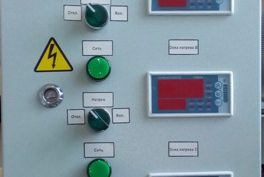 Система состоит из шкафа управления и датчиков температуры. Сигнал с датчиков температуры поступает на входы регуляторов температуры каждой зоны. Регуляторы температуры в соответствии с заданием, установленным оператором по технологической карте, управляют нагревательными элементами, поддерживающими температуру в соответствующих зонах установки.
