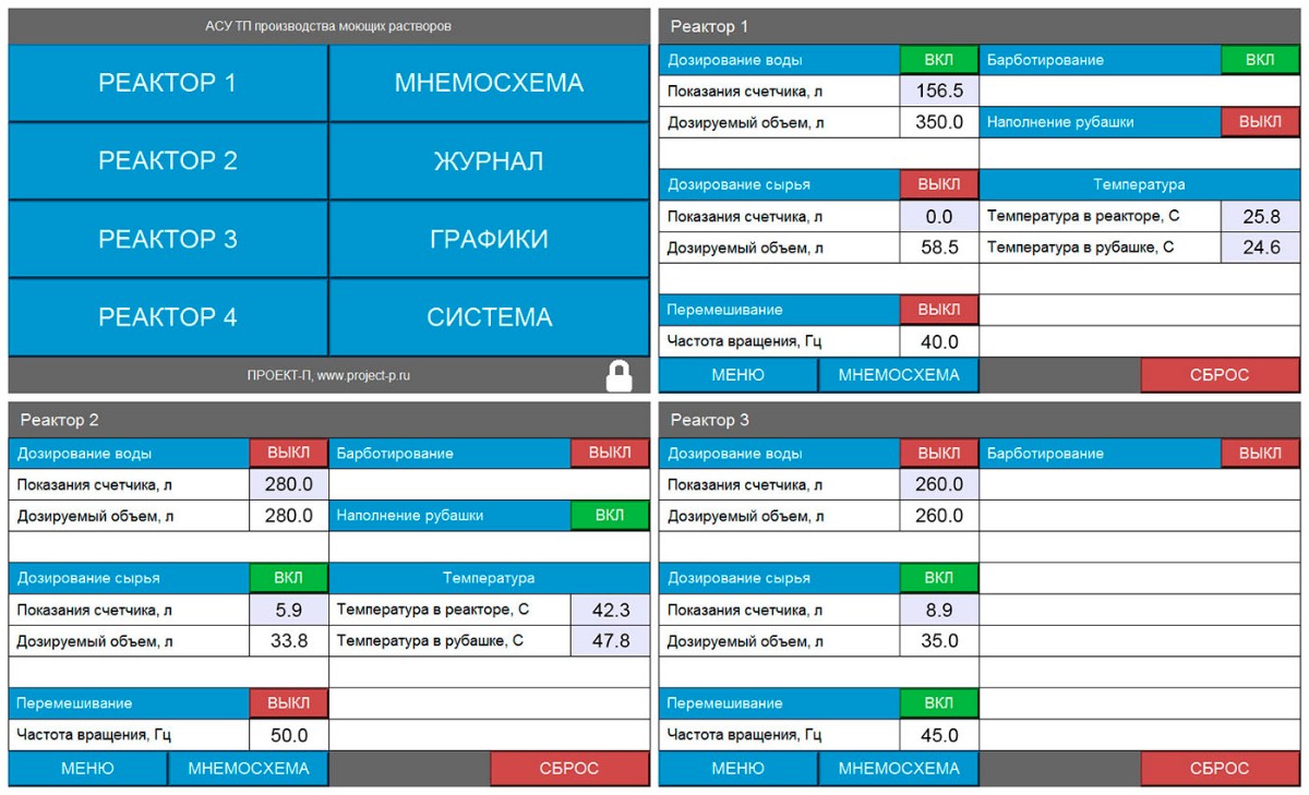 Главное меню панели оператора состоит из восьми разделов: РЕАКТОР 1, РЕАКТОР 2, РЕАКТОР 3, РЕАКТОР 4, МНЕМОСХЕМА, ЖУРНАЛ, ГРАФИКИ, СИСТЕМА. С помощью экранов РЕАКТОР 1…4 оператор производит управление соответствующими реактору технологическими подпроцессами: дозирование воды и сырья, управление мешалкой, барботирование, а также контролирует температуру воды в рубашке и продукта в реакторе. Управление осуществляется в полуатоматическом режиме, перед запуском какого-либо подпроцесса оператор вручную открывает/закрывает ручные задвижки и клапана и запускает необходимый подпроцесс для выбранного реактора.