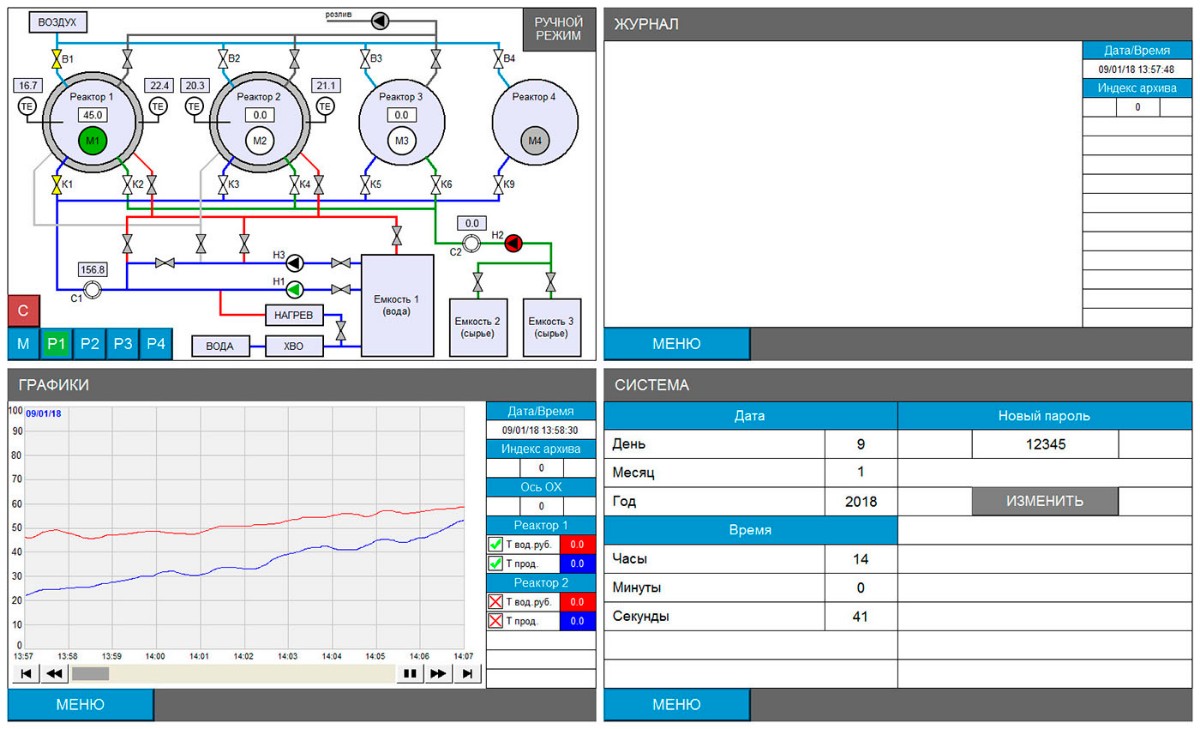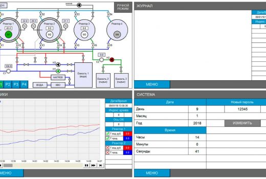 Ручное управление осуществляется нажатием на соответствующий исполнительный механизм. На экране ЖУРНАЛ отображается хронология событий технологического процесса и аварийных ситуаций. На экране ГРАФИКИ – графики температуры воды в рубашке и продукта в реакторах №1 и №2. На экране СИСТЕМА задаются настройки панели оператора: дата, время, пароль доступа.