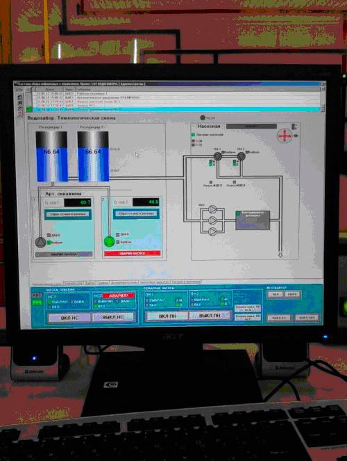 Система управления данным объектом была построена на основе прибора компании «ОВЕН» — программируемого логического контроллера ПЛК110-24.60.К-М и приборов компании ЗАО НПП «ЭИС» — измерительного преобразователя ИП и модуля дискретных входов с контролем состояния линии. ПЛК включает/выключает насосы артезианских скважин №1 и №2, расположенных в 30 метрах от насосной. Связь ПЛК и ИП осуществляется по интерфейсу RS-485 по протоколу Modbus RTU.