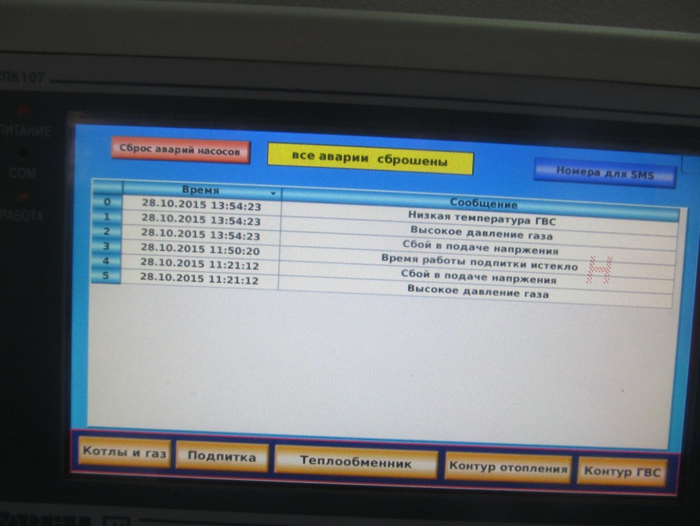 - Отправка текстовых SMS-сообщений по каналу GSM при аварии на три заданных номера (при необходимости количество номеров можно увеличить) с указанием точной причины остановки котельной.