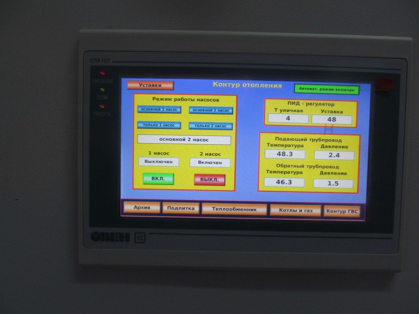 На базе оборудования ОВЕН разработана система диспетчеризации, контроля и управления (СДК-У) блочно-модульной котельной мощностью 1,5 МВт. В основе системы управления – программируемый контроллер ОВЕН ПЛК110-60, панельный контроллер ОВЕН СПК107, программируемое реле ОВЕН ПР110, модули ввода-вывода ОВЕН МВ110-8А и МВ110-8АС, GSM-модем ОВЕН ПМ01, датчики давления ОВЕН ПД100, датчики температуры ОВЕН ДТС014, блоки питания ОВЕН БП14.