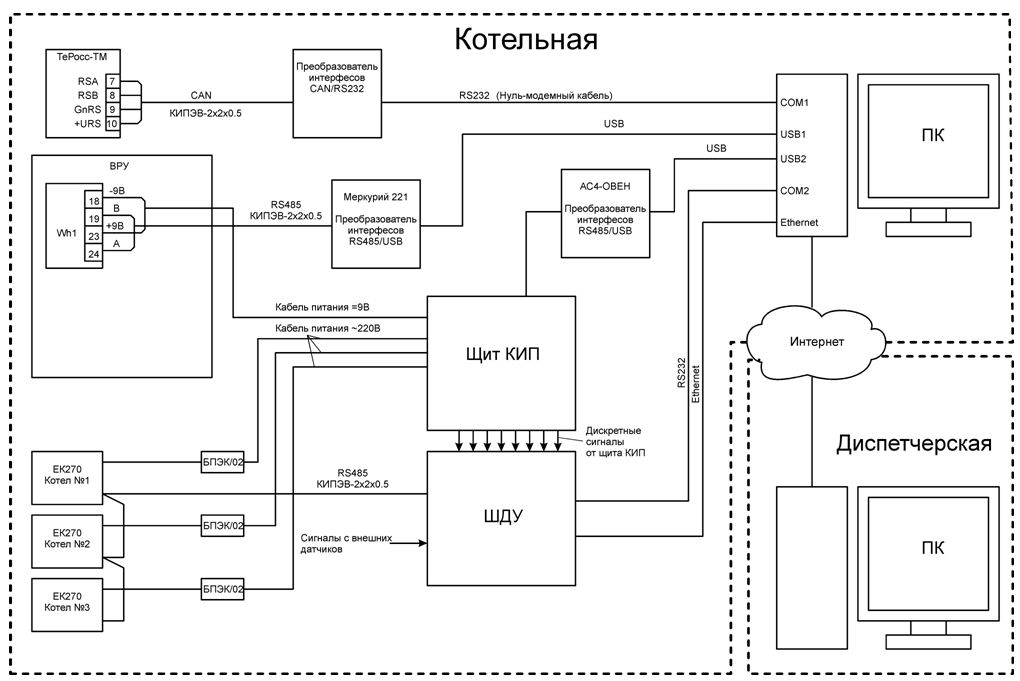 Основной задачей шкафа ШДУ является преобразование полученных аналоговых и дискретных сигналов в цифровой вид с определенной программной обработкой для дальнейшей передачи на персональный компьютер (ПК), который так же установлен в котельной. Также в шкафу диспетчерского управления установлен преобразователь интерфейсов RS-485/RS-232 для передачи измеряемой информации с покотловых счетчиков газа, оборудованных электронными корректорами EK270 на ПК котельной.