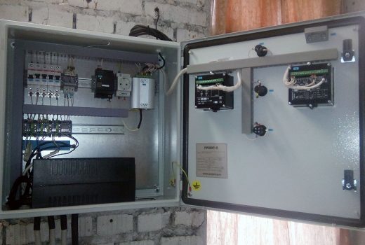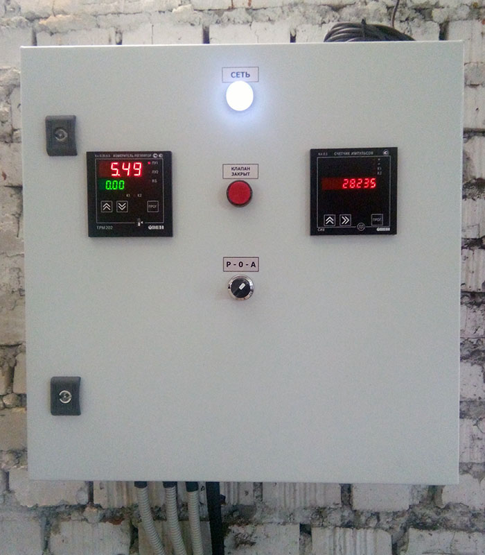 По интерфейсу RS-485 к контроллеру подключены измеритель регулятор ОВЕН ТРМ202, посредством которого производится измерение давления водопроводной воды, и счетчик импульсов ОВЕН СИ8, посредством которого производится учет объема, а также вычисление расхода водопроводной воды. К измерителю регулятору ОВЕН ТРМ202 подключен датчик давления водопроводной воды. К счетчику импульсов ОВЕН СИ8 подключен механический счетчик воды с импульсным выходом. Защита оборудования от перегрузки и токов короткого замыкания осуществляется с помощью автоматических выключателей.