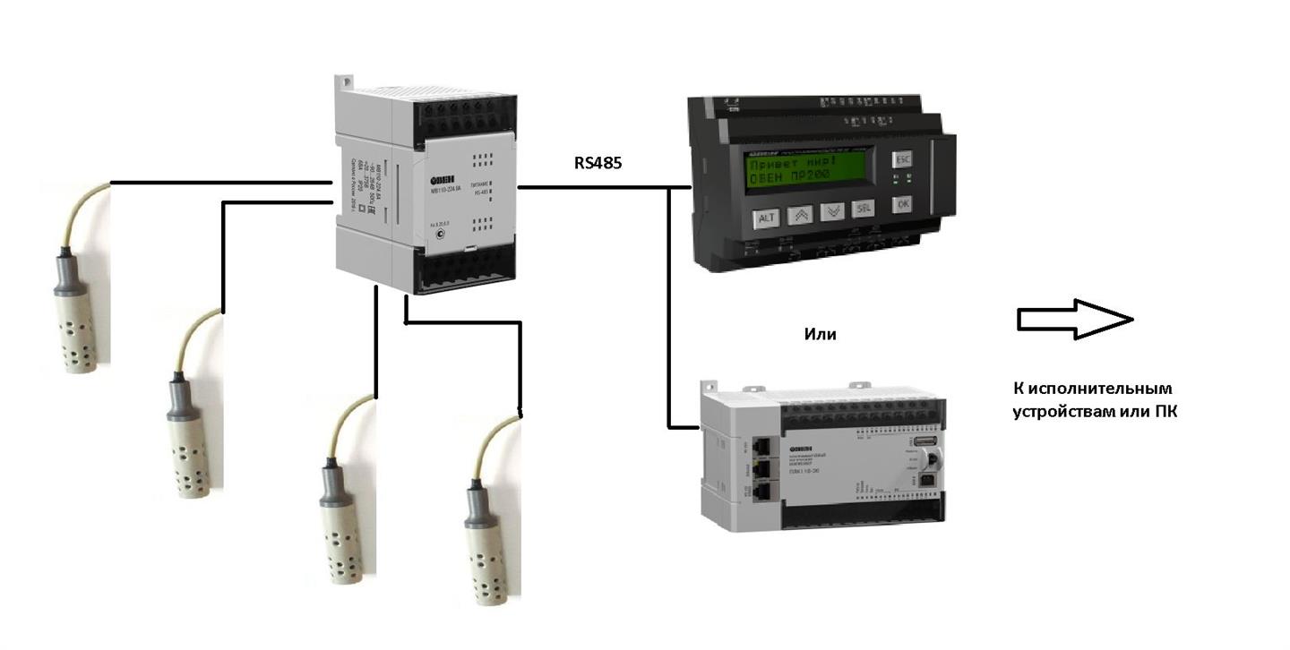 Датчик растворенного кислорода (датчик компании ЭКОПРИБОР) и датчик температуры через вторичный преобразователь ОВЕН МВ110-8А по RS 485 передают значения на программируемое реле ОВЕН ПР200 (или ПЛК), в котором производится вычисление количества растворенного кислорода с учетом термокомпенсации. Применение в системе управления ПР200 или контроллера зависит от количества датчиков (если система будет состоять из 4 датчиков кислорода, то дешевле использовать ПР200, если количество датчиков 16 или больше, то целесообразно применять ПЛК).