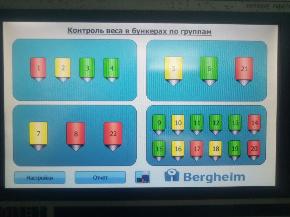 - сводный экран цветовой индикации состояния бункеров (пустой, половина, заполнен);