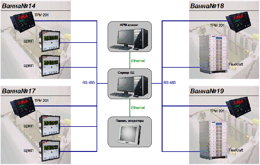 Все оборудование cервера БД размещено в пультовой конструкции серии КонсЭрго®. Сбор технологических данных от приборов различных производителей осуществляется с использованием OPC-сервера протоколов MODBUS разработки НПФ «КРУГ». Панель оператора-гальваника расположена в помещении цеха гальваники – производства с агрессивной средой.