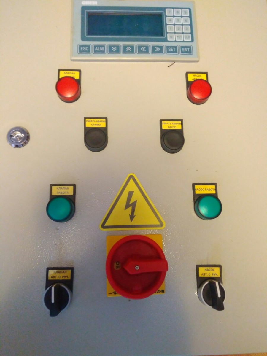 Степень защиты шкафа IP65, панель оператора с понятным интерфейсом. Уровень воды поддерживается в заданном диапазоне. Световая сигнализация оповещает оператора об отклонении уровня и выходе из строя исполнительных механизмов.
