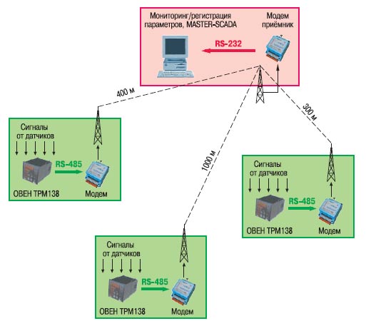 Поиск оптимального решения при организации автоматизированных комплексов на обширных территориях обнаружил целый ряд проблем. Одна из них — организация надёжной связи между удалёнными объектами и пунктами сбора и анализа информации. Из-за разнесённости станций по территории предприятия и сложности прокладки кабельных коммуникаций начальник отдела КИПиА Рогов Евгений Станиславович решил использовать радиомодемы НЕВОД-5 совместно с универсальными восьмиканальными измерителями-регуляторами ОВЕН ТРМ138 и системой мониторинга и регистрации Master SCADA фирмы ИнСат.