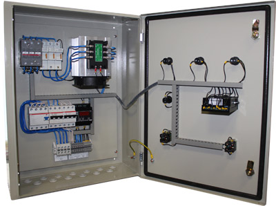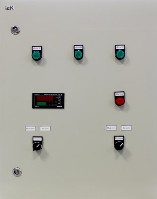 При подаче напряжения на шкаф включается индикация приборов. При повороте переключателя «Останов» в положение «Вкл» происходит отключение регулирования ПИД-регулятора ТРМ210. При повороте переключателя «Аварийное отключение нагрева» в положение «Вкл» происходит отключение нагрева. О нагреве по каждой фазе сигнализируют 3 зеленых светодиодных лампы. Нагрев происходит в автоматическом режиме после настроек приборов ТРМ. В случае аварийного выхода температуры за выставленный предел загорается красная лампа.