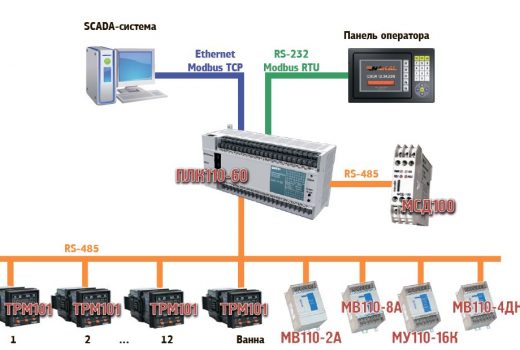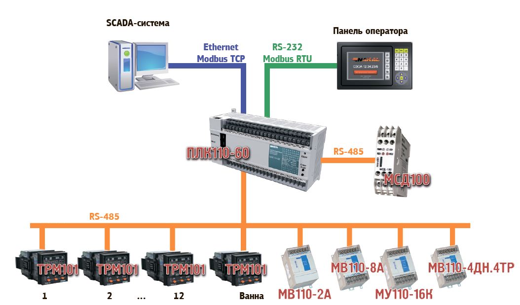 Подключение ПЛК110-60 к SCADA-системе выполняется по каналу Ethernet с использованием протокола Modbus TCP. Для подключения можно использовать как отдельную линию, так и уже существующую локальную сеть предприятия.