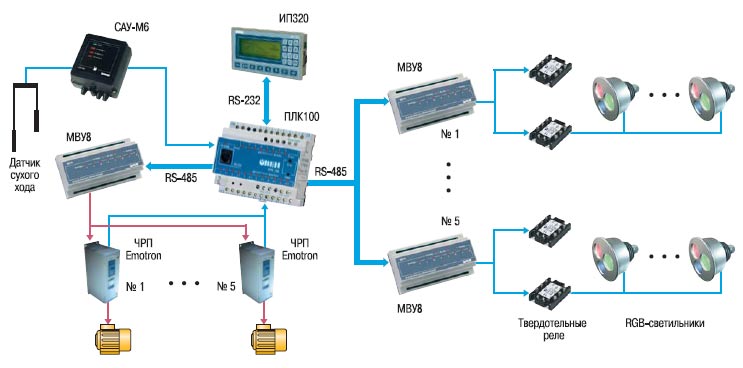 Все элементы АСУ фонтанного комплекса объединены в модули, размещённые для удобства в отдельно стоящих шкафах управления. Связь между элементами внутри шкафа осуществляется по интерфейсу RS-485, работающему по протоколу ОВЕН. Сигналы с контроллера ПЛК100 через модуль расширения МВУ8 поступают на частотные преобразователи, обеспечивавшие работу электродвигателей насосов. Контроль уровня воды в накопительной ёмкости фонтана осуществляется сигнализатором уровня жидкости САУ-М6.Для управления световым оборудованием фонтана применены пять модулей расширения МВУ8, работающих совместно с симисторными твердотельными реле. Модули подключены к контроллеру ПЛК100 через интерфейс RS-485 по протоколу ОВЕН. Включение и выключение светильников каждого контура осуществляется по разработанной дизайнером программе. При каждом последующем включении светильника его цвет меняется согласно установленной последовательности: красный-жёлтый-голубой.