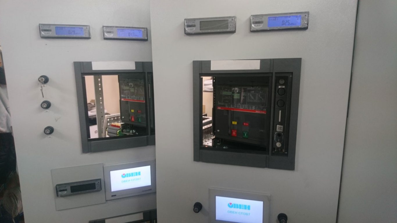 В соответствии с техническим заданием было необходимо обеспечить управление и контроль работы ГРЩ как в автоматическом, так и в ручном режиме. Автоматический режим, по требованию заказчика, обеспечивается работой АВР типа АTS022. Управление всей системой и контроль за ATS022 производится с помощью программируемого контроллера ОВЕН ПЛК63. Связь между удаленными модулями и пультом управления и контроля в диспетчерской осуществлена по интерфейсу RS-485. Ручное управление и демонстрация параметров вводных и отходящих линий производится при помощи сенсорной панели оператора ОВЕН СП307 по интерфейсу RS-232. Также в систему включены приборы контроля и учёта Меркурий 236.