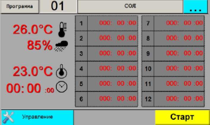 Благодаря созданной системе управления в лотках с семенами поддерживаются оптимальная влажность и температурный режим, контроль орошения семян производится по задаваемым в программном обеспечении алгоритмам. Основной экран управления расположен на дисплее панели оператора СПК107. Нажатие на данные элементы вызывает те или иные предусмотренные действия со стороны системы.