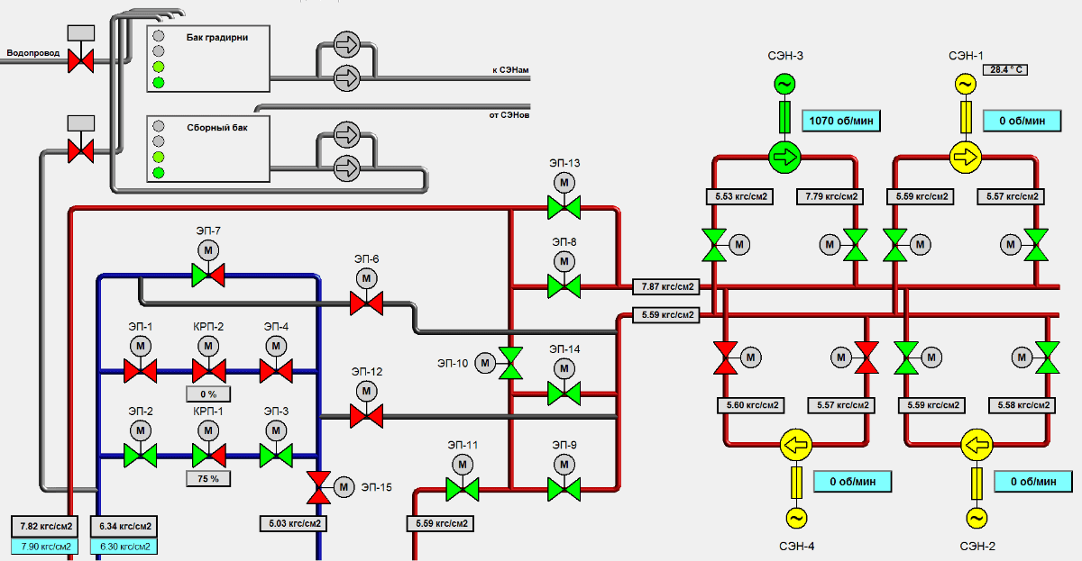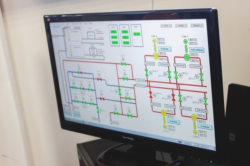 Разработанная инженерами оригинальная SCADA-система позволяет оператору оперативно отслеживать параметры теплоносителя на входе и выходе из ПНС. Для простоты и наглядности системы конфигурация трубопроводов на мнемосхеме повторяет расположение труб в ПНС.