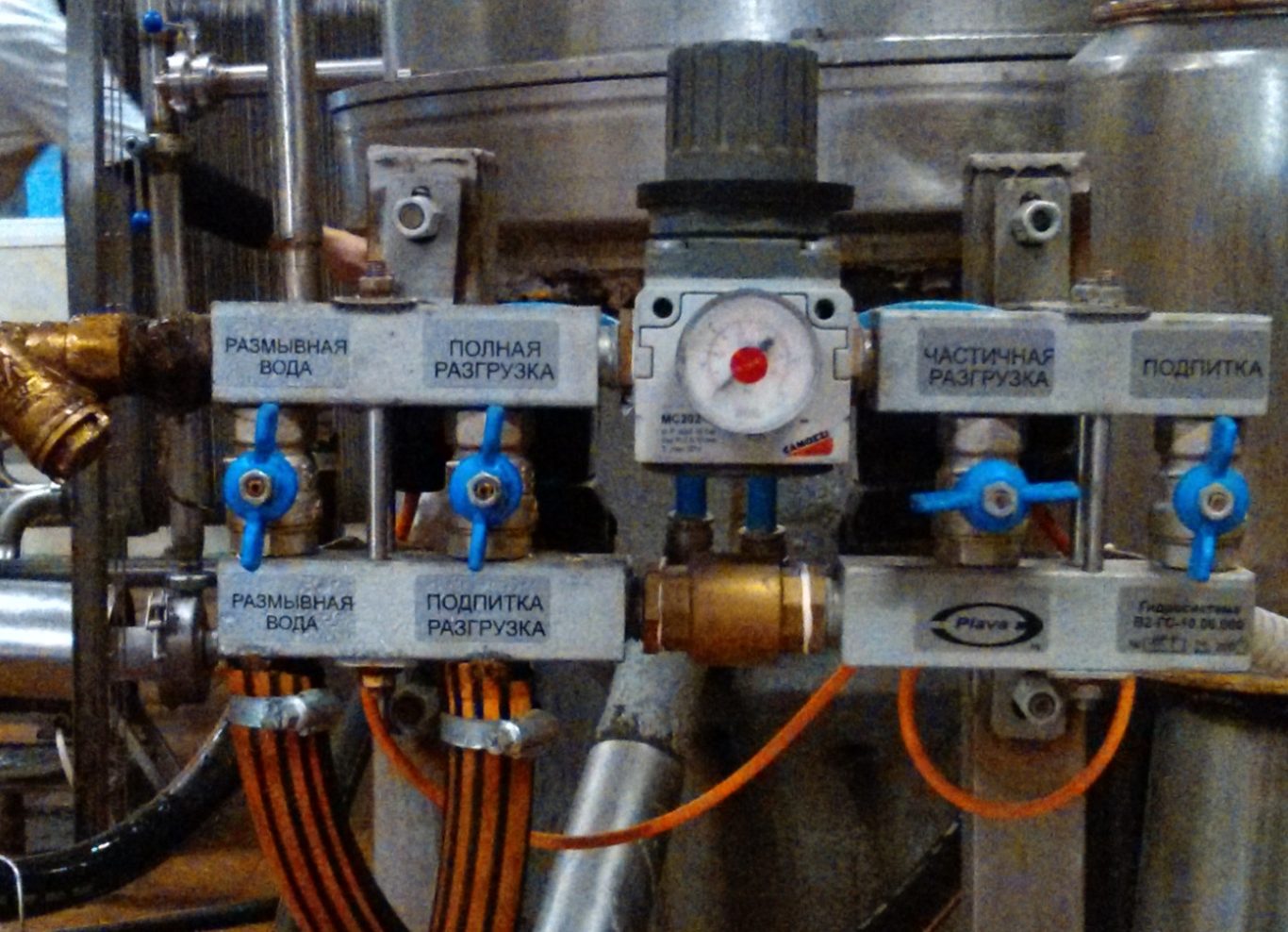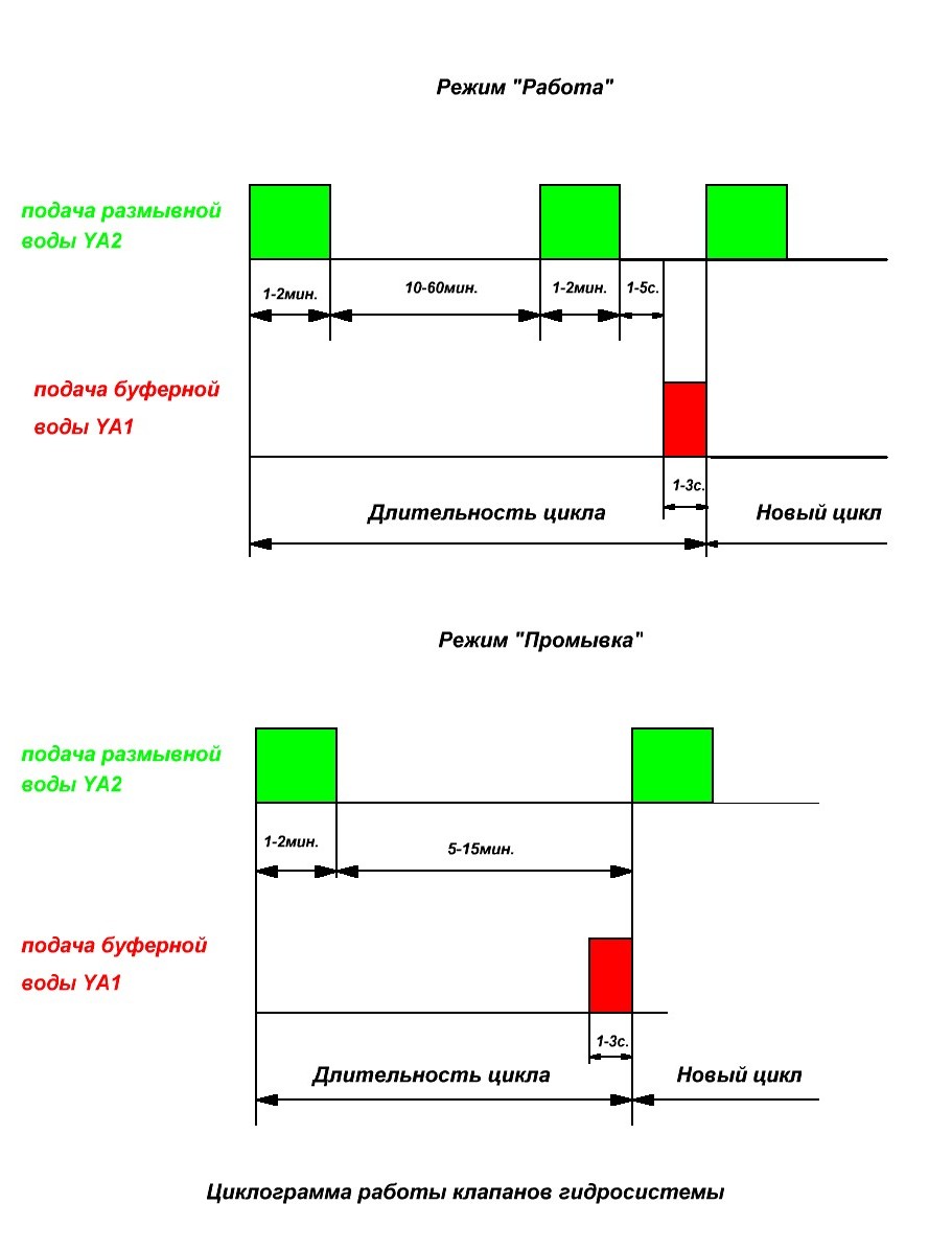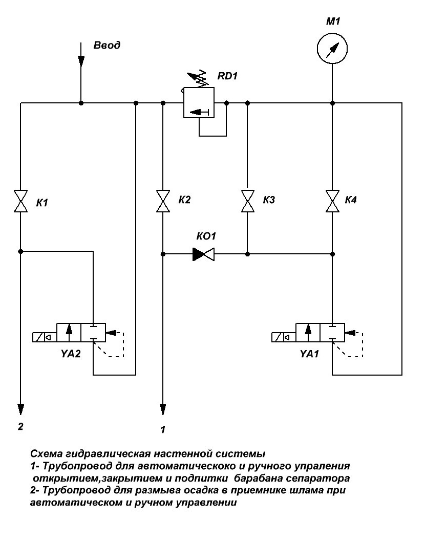 Гидравлическая система используется совместно с ценробежным сепаратором и предназначена для подачи воды для подпитки барабана сепаратора,выгрузка осадка из барабана сепаратора,а также для промывки приемника овадка в ручном и автоматическом режимах управления сепараторм.
