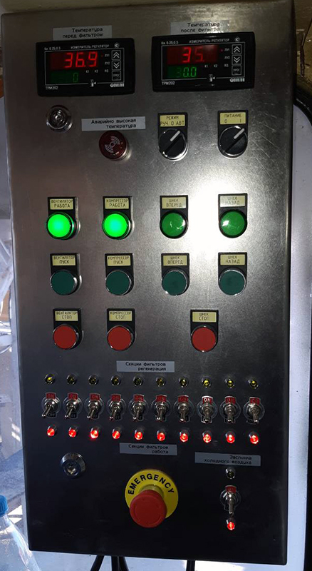 Шкаф управления рукавным фильтром – осуществляет автоматическую регенерацию рукавов одного фильтра (до 10 рукавов) на основании показаний датчика разряжения фильтра, контролирует положение пневмоцилиндров продувки и температуру газа перед и после фильтра. Управляет вентилятором продувки фильтров, дымососом, компрессором, шнековым конвейером для удаления пыли, а также заслонкой подсоса свежего воздуха.